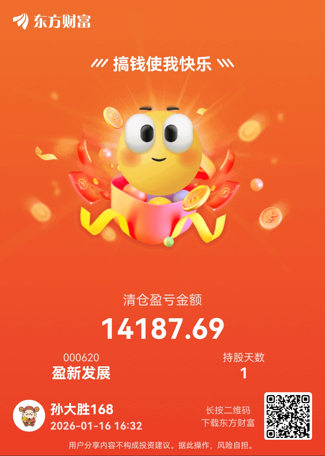 $盈新发展(SZ000620)$ 昨天尾盘3.05买的,今天上午3.22卖了,知足了。