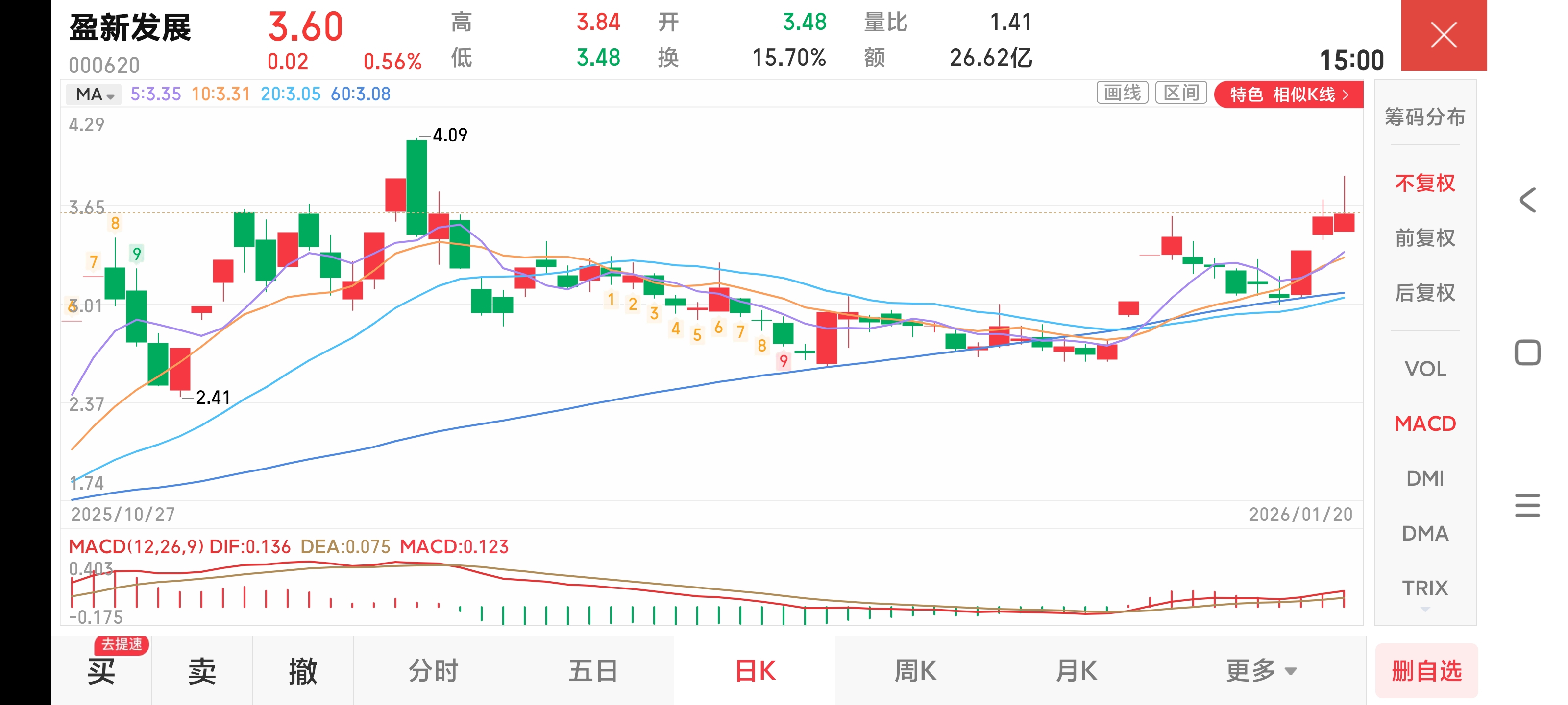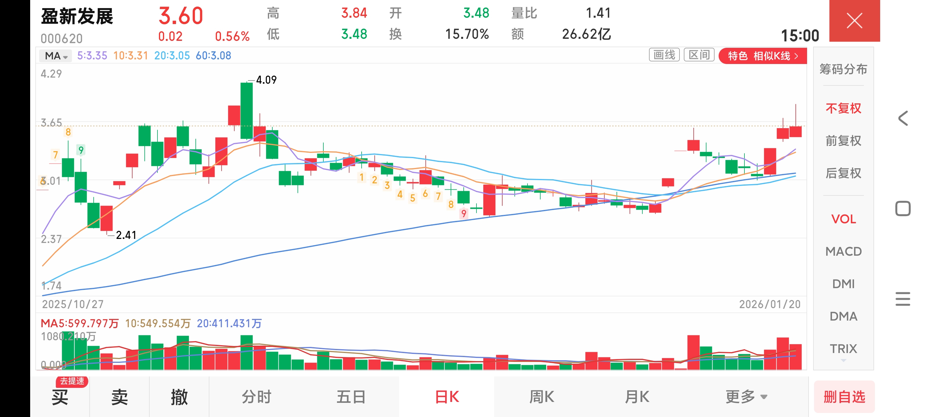 $盈新发展(SZ000620)$ 盈新发展明天K线20天线会上穿60天线,5-10-20-60天均线形成了完全的多头排列,MACD零轴向上二次上行,离前高4.09元只相差一个涨停板出头,月线这个月是主升浪月,1月份升到多少价格都不奇怪。在这个点位方向只有一个,向上放量突破前高,1月份股价必过5摸6。