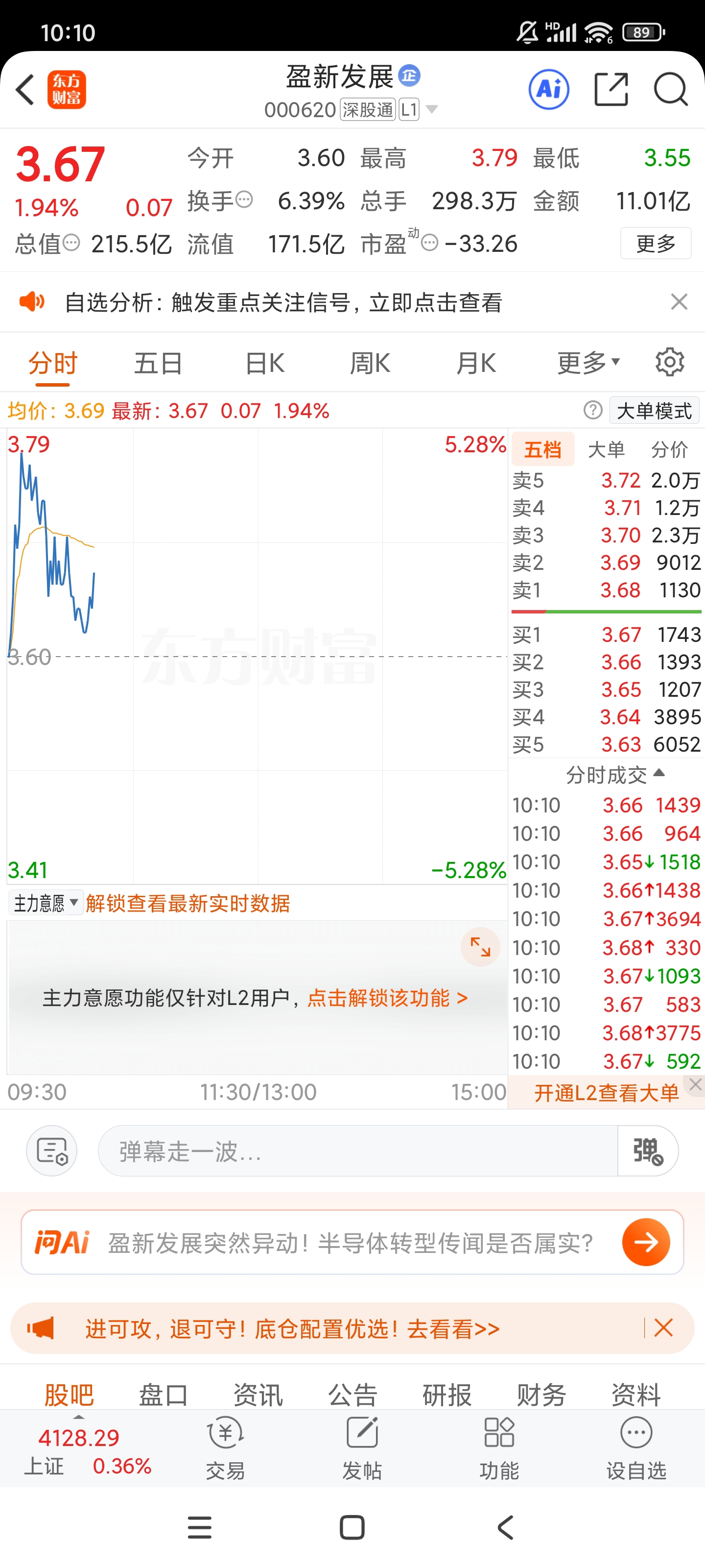$盈新发展(SZ000620)$ 3.74卖,3.65买回,继续持股等向上突破。
