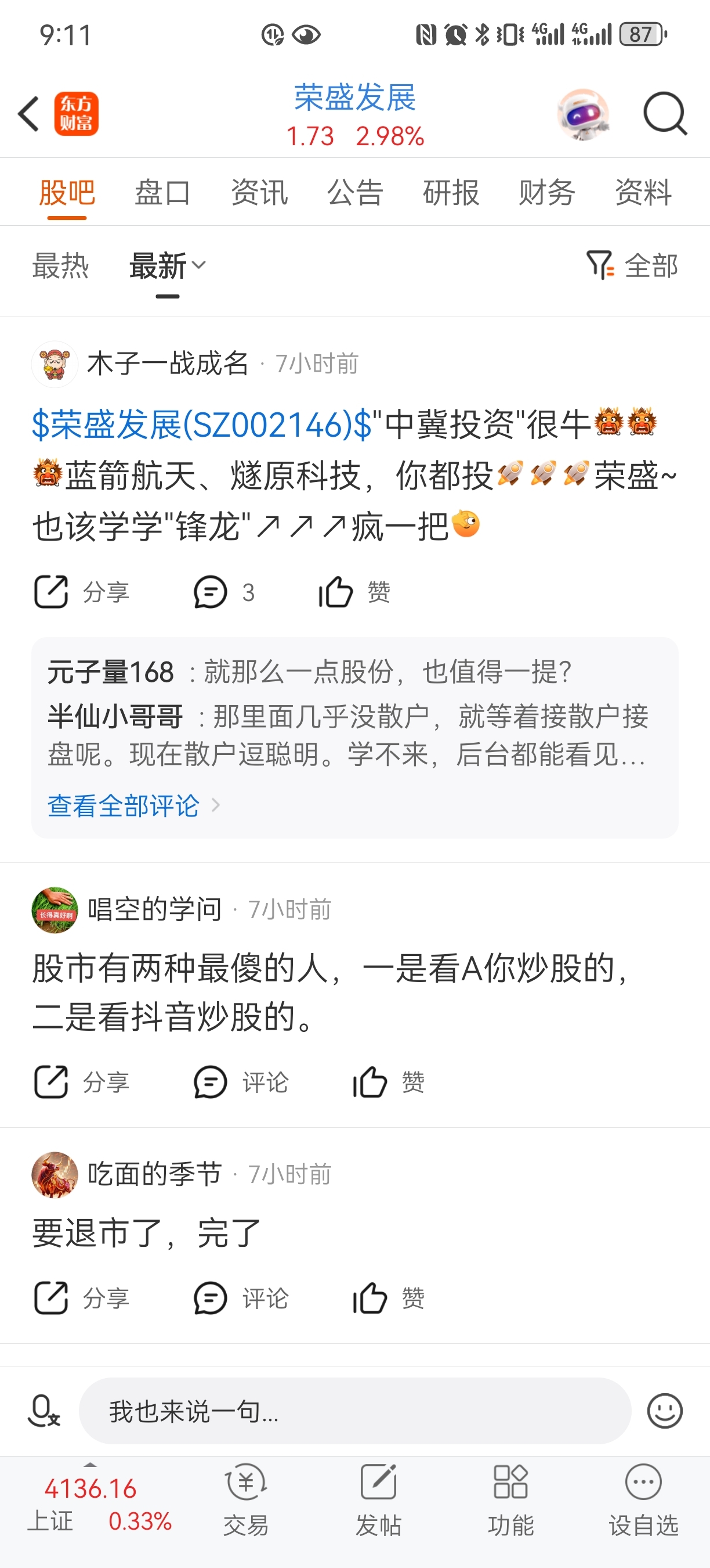 温馨提示: 1.根据《证券法》规定,禁止编造、传播虚假信息或者误导性信息,扰乱证券市场;2.用户在本社区发表的所有资料、言论等仅代表个人观点,与本网站立场无关,不对您构成任何投资建议。用户应基于自己的独立判断,自行决定证券投资并承担相应风险。《东方财富社区管理规定》