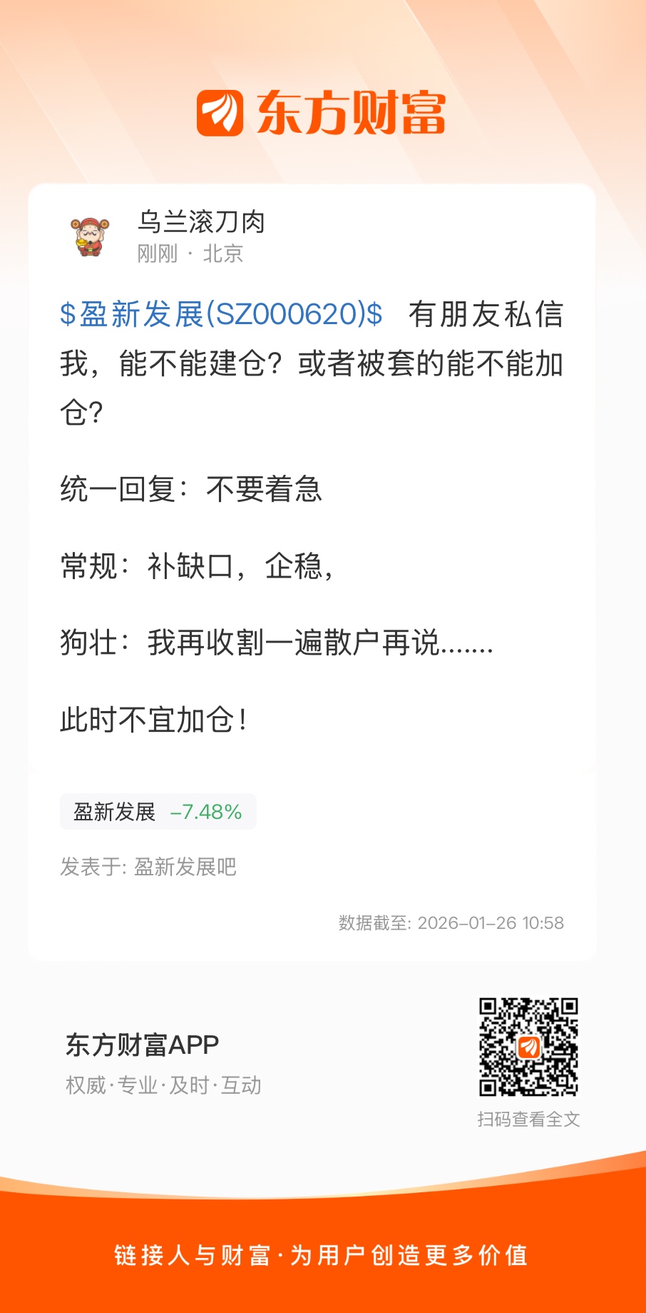 温馨提示: 1.根据《证券法》规定,禁止编造、传播虚假信息或者误导性信息,扰乱证券市场;2.用户在本社区发表的所有资料、言论等仅代表个人观点,与本网站立场无关,不对您构成任何投资建议。用户应基于自己的独立判断,自行决定证券投资并承担相应风险。《东方财富社区管理规定》