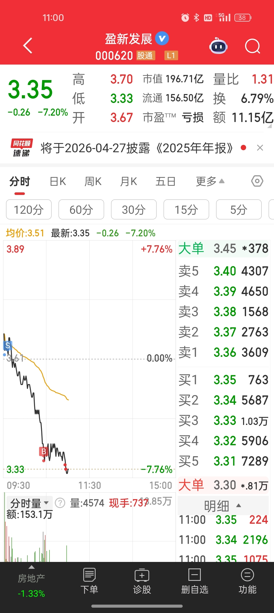 $盈新发展(SZ000620)$ 各位,明天还要下杀一波(但这靠猜,具体下杀与否我就不知道了),我是执行周末预判才加满仓的,明天应该能有低价。今天不但没亏钱,还小小赚一点点,做了个小差价