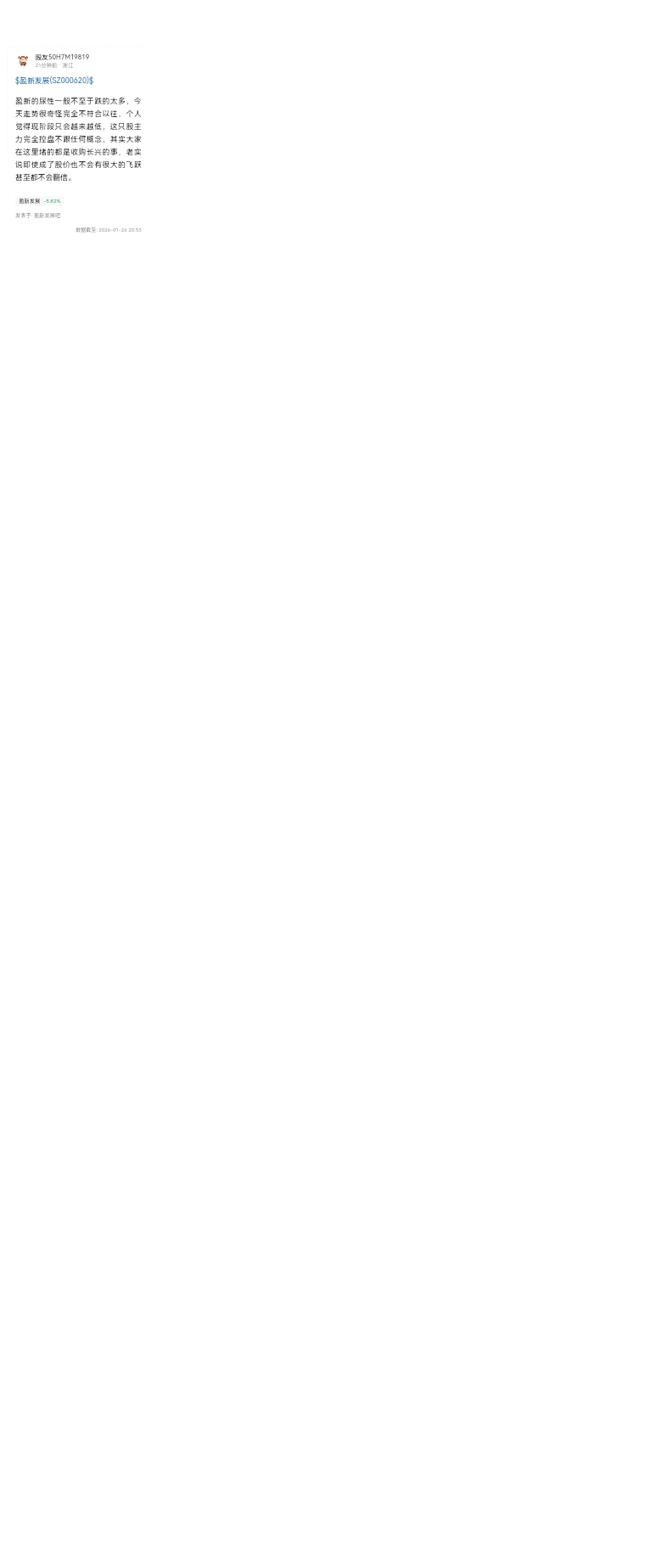 盈新的尿性一般不至于跌的太多,今天走势很奇怪完全不符合以往,个人觉得现阶段只会越来越低,这只股主力完全控盘不跟任何概念,其实大家在这里堵的都是收购长兴的事,老实说即使成了股价也不会有很大的飞跃甚至都不会翻倍。