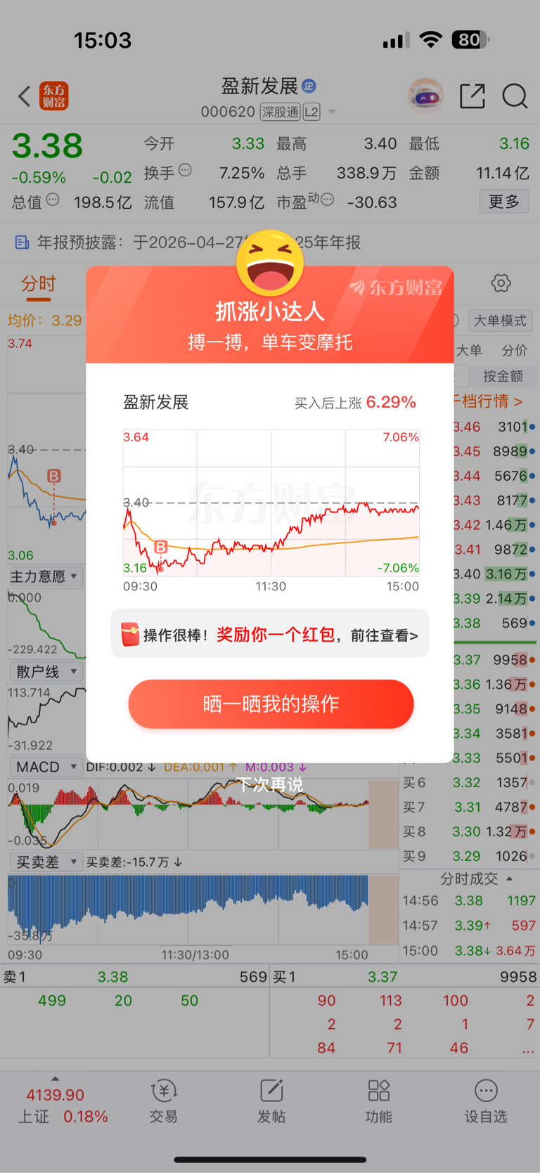 $盈新发展(SZ000620)$ 今天鬼使神差的打了满仓,也不知道咋回事