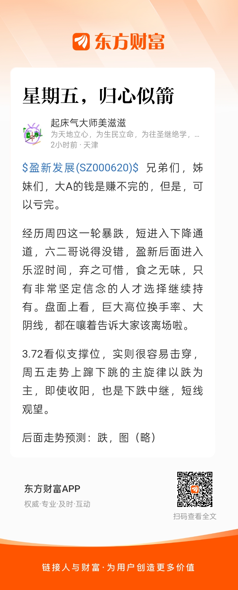 $盈新发展(SZ000620)$ 兄弟们,姊妹们,大A的钱是赚不完的,但是,可以亏完。