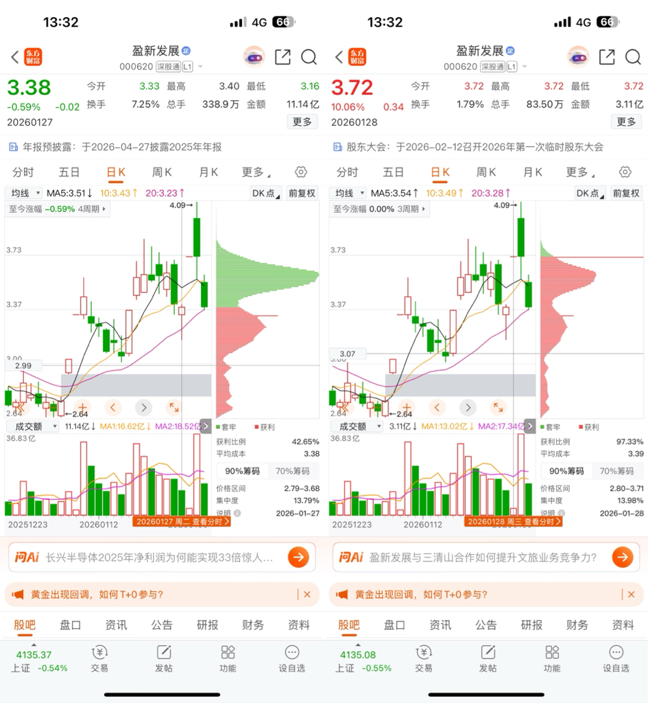$盈新发展(SZ000620)$ 涨停板前一天和涨停板那天的筹码图,下面筹码大量派发给那天开盘打板排单的