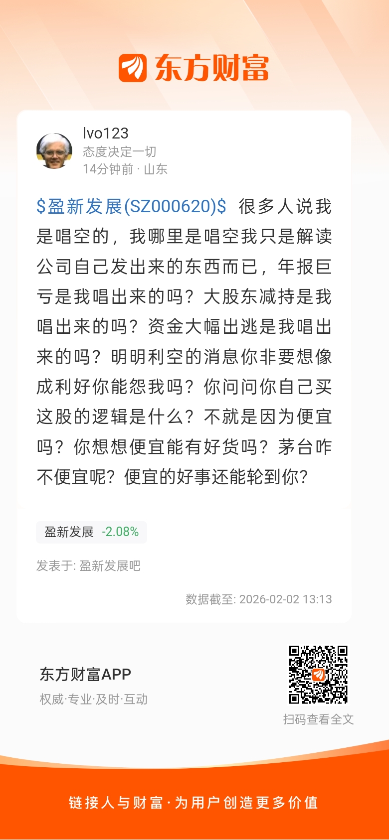 $盈新发展(SZ000620)$ 很多人说我是唱空的,我哪里是唱空我只是解读公司自己发出来的东西而已,年报巨亏是我唱出来的吗?大股东减持是我唱出来的吗?资金大幅出逃是我唱出来的吗?明明利空的消息你非要想像成利好你能怨我吗?你问问你自己买这股的逻辑是什么?不就是因为便宜吗?你想想便宜能有好货吗?茅台咋不便宜呢?便宜的好事还能轮到你?