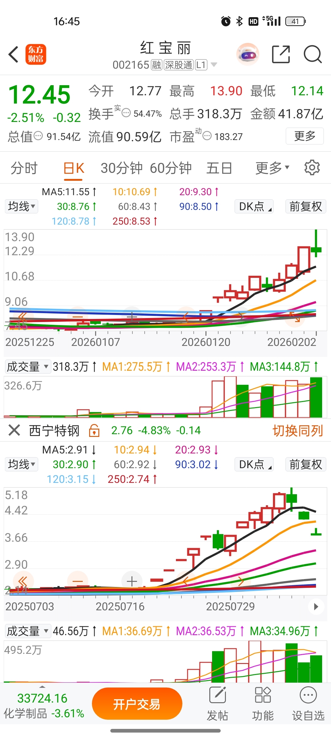 $盈新发展(SZ000620)$ 对比图(红宝丽-西宁特钢)