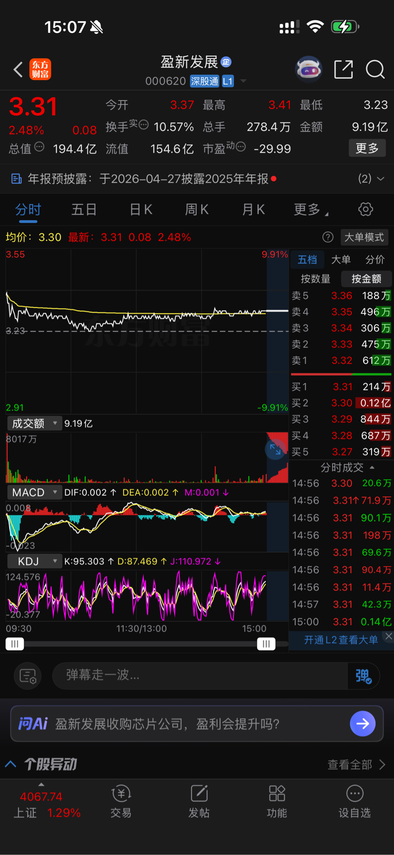 $盈新发展(SZ000620)$ 哇塞,今天500多家跌,他居然暴涨2个多点啊,太厉害了吧。简直是大牛股。你这看走势多稳健啊,行云流水四平八稳啊,开盘3.37收盘3.31。开盘买进的只亏6分钱而已呀,6分钱这数字多吉利啊!关键便宜啊只要3块多一股这么便宜的整个市场也不多吧是不是,大白菜都3钱一斤呢,所以啊韭菜们赶紧买起来吧韭菜炒白菜,菜菜菜!