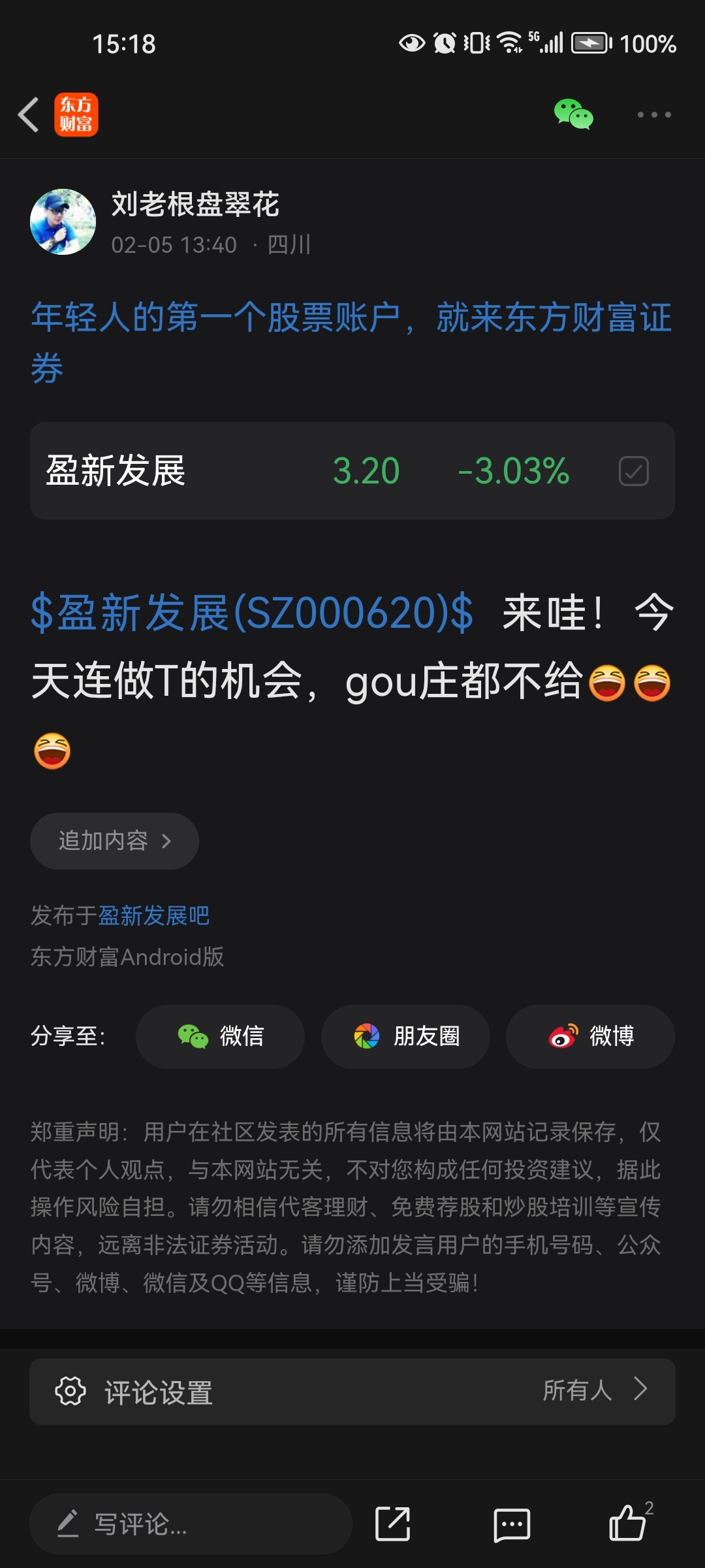 $盈新发展(SZ000620)$ 唉…昨日幸好出货,留一层万年不动的底仓,今日早盘3.18入500手,准备做一个小T,盼来盼去就1~2分钱的规模,老根都下不去手呀!
