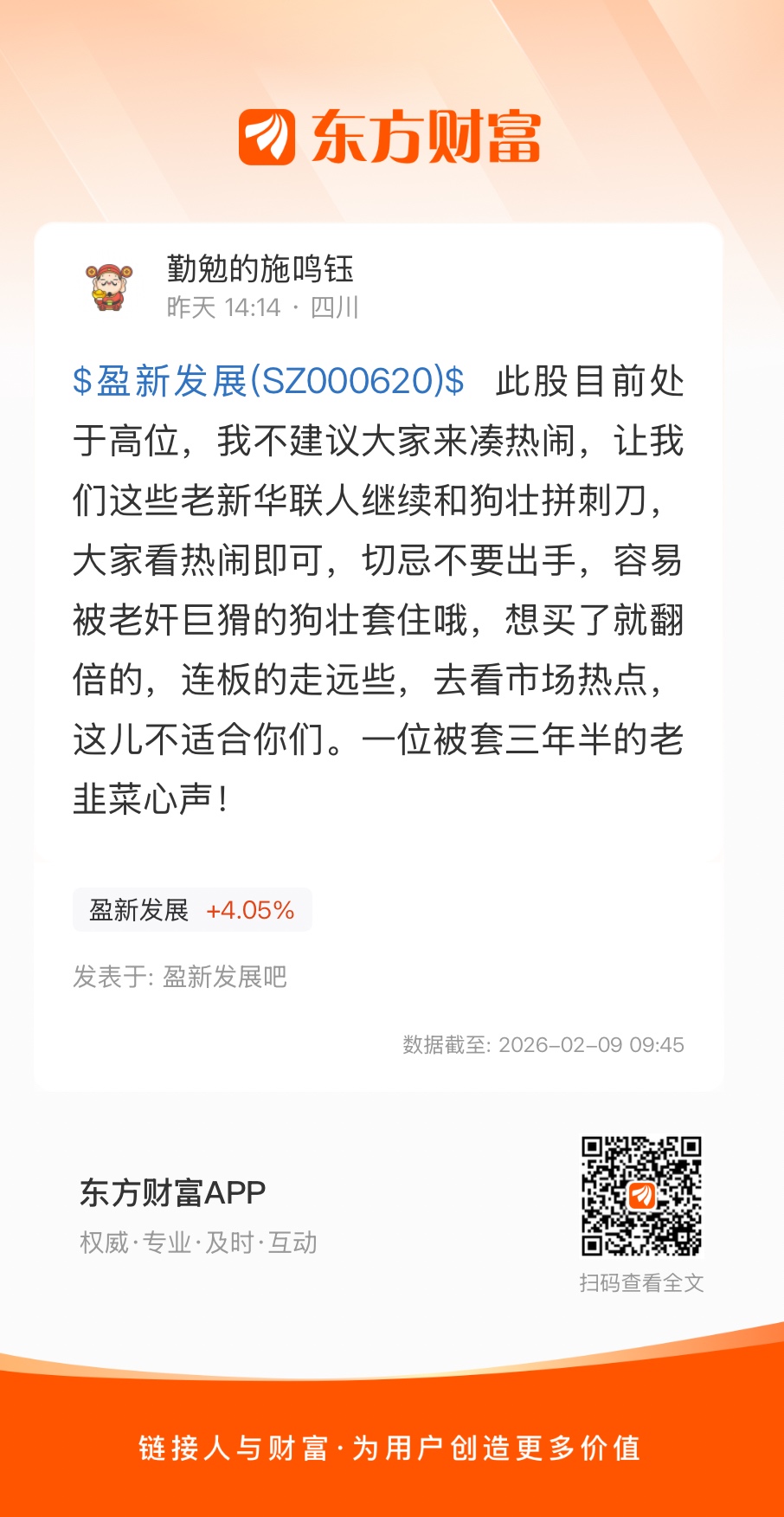 $盈新发展(SZ000620)$ 此股目前处于高位,我不建议大家来凑热闹,让我们这些老新华联人继续和狗壮拼刺刀,大家看热闹即可,切忌不要出手,容易被老奸巨猾的狗壮套住哦,想买了就翻倍的,连板的走远些,去看市场热点,这儿不适合你们。一位被套三年半的老韭菜心声!