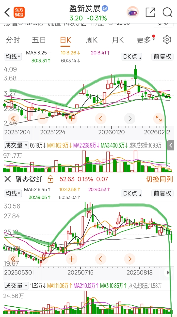 参考聚杰微纤,今天盈新必须拉回,要不前面就是万丈深渊,这两个走势类似