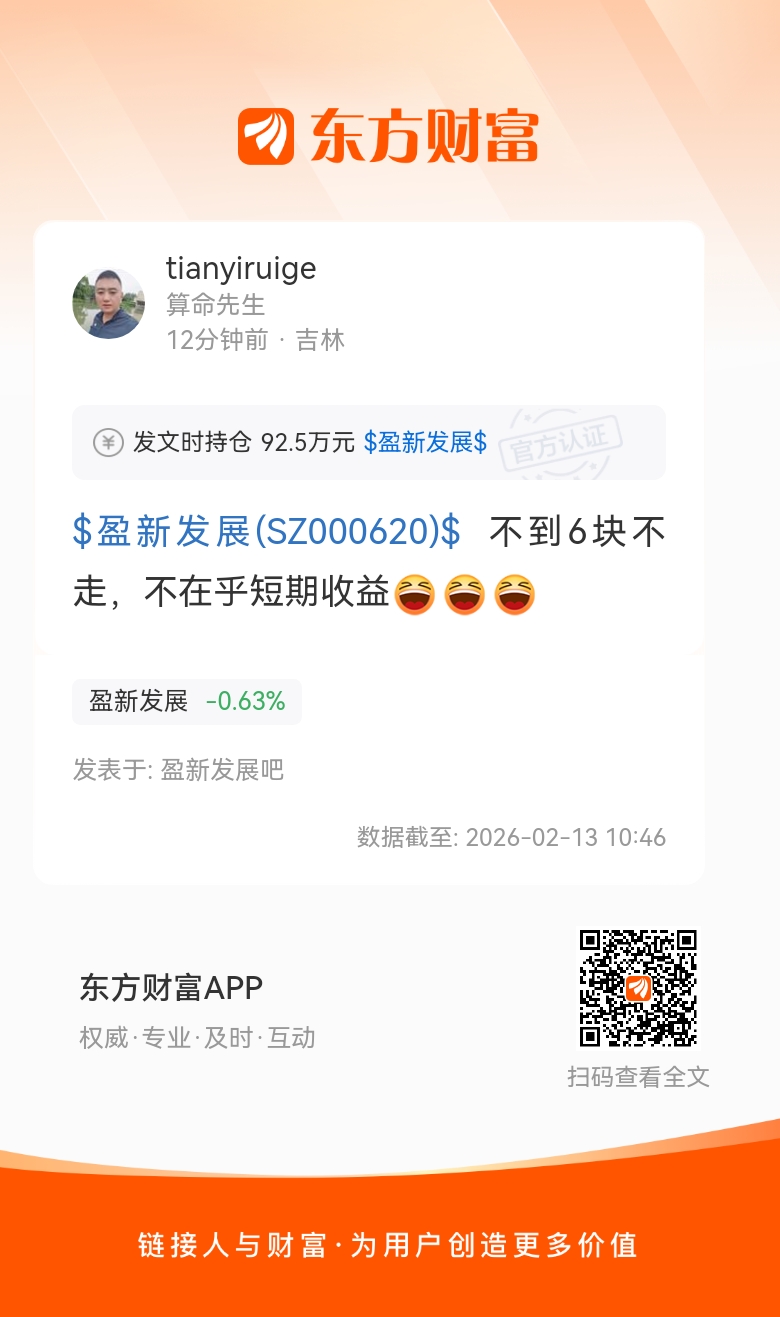 $盈新发展(SZ000620)$  不到6块不走,不在乎短期收益