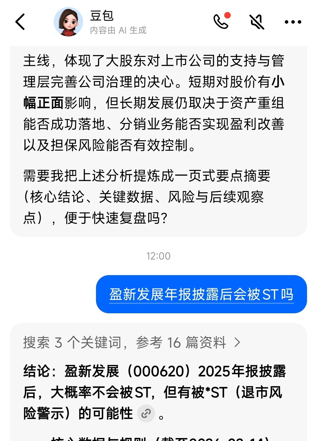 吧里不要胡说八道了,好消息是盈新明确不会被ST的。坏消息是年报后会直接一步到位被*ST,还好3.2清仓了,节后迎接暴击吧你们