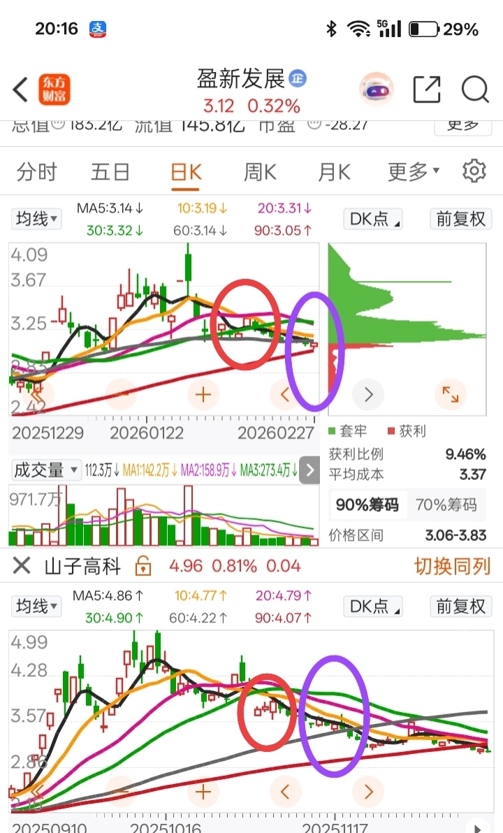 $盈新发展(SZ000620)$ 我觉得目前盈新走势与去年山子剧本很像,那么,下面90日均线也不是强支撑,附图如下
