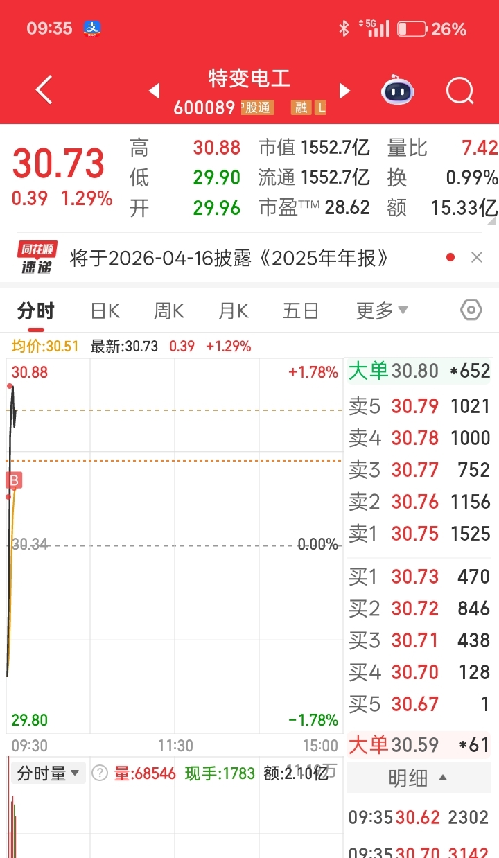 $盈新发展(SZ000620)$ 特变电工,鄙人不才,全仓买入,杠杆拉满,成本30.58,仓位100%,今日基操已完成,晒图如下(贪心,想低点再买,错失良机果断冲高追入还好没踏空)明天看情况出了特变再进二六三,二六三开盘清仓啦