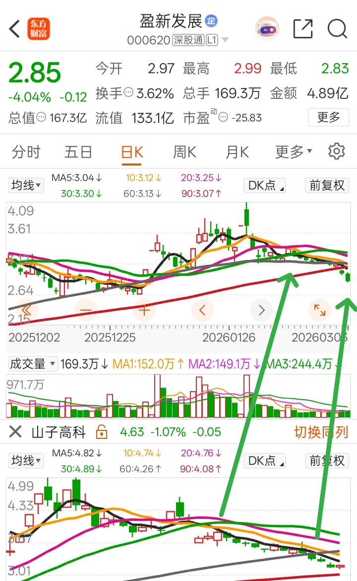 $盈新发展(SZ000620)$ 盈新走势看山子,盈新用了山子去年剧本,目前已砸穿下方均线,对应山子剧本阳线后第二个阴线,如图