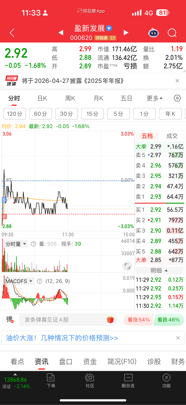 $盈新发展(SZ000620)$ 资金实打实每天在跑路,每天都是大单砸然后撤掉压单就拉一下反弹上来再慢慢下压派发筹码,资金流出持续增大!恶庄无时无刻不在倒手T货,散户一动不动的就一直被套死在山顶,之前一直强调要利用小仓位跟随恶庄滚动做T,能T一点是一点,不然解套遥遥无期,到时先腰斩了即便后面给你涨10个点也远远回不了本,而恶庄赚得盆满钵满