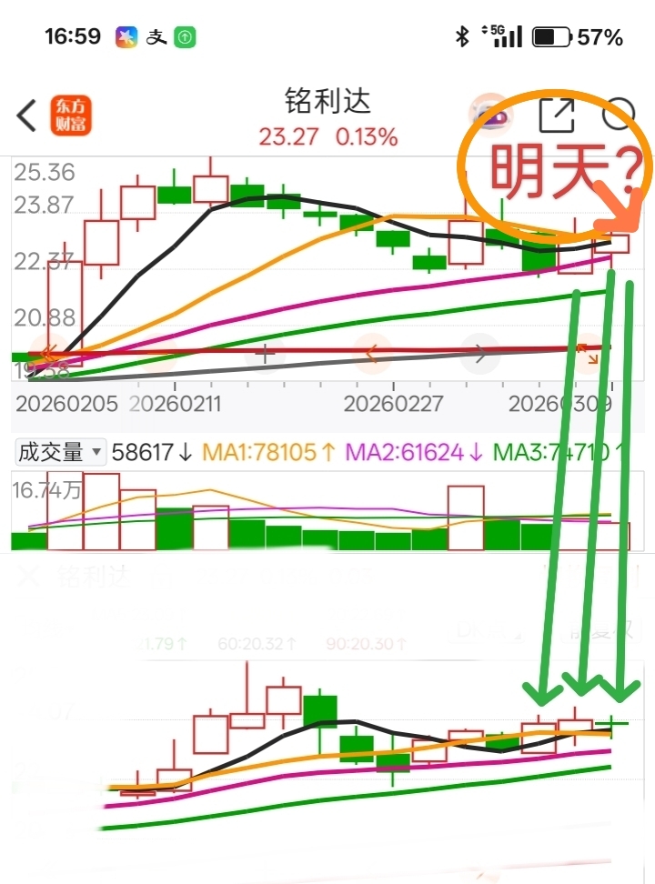 $盈新发展(SZ000620)$ 我的秘诀是重仓猛干浮盈加仓频繁交易技术分析,盈新虽然涨了,目前仍在下降通道,和盈新一样,铭利达涨的也还可以,但属于技术性修复,很多人等明天大长腿,而我却在做溜之大吉的打算,这是铭利达明天走势畅想图,附图如下