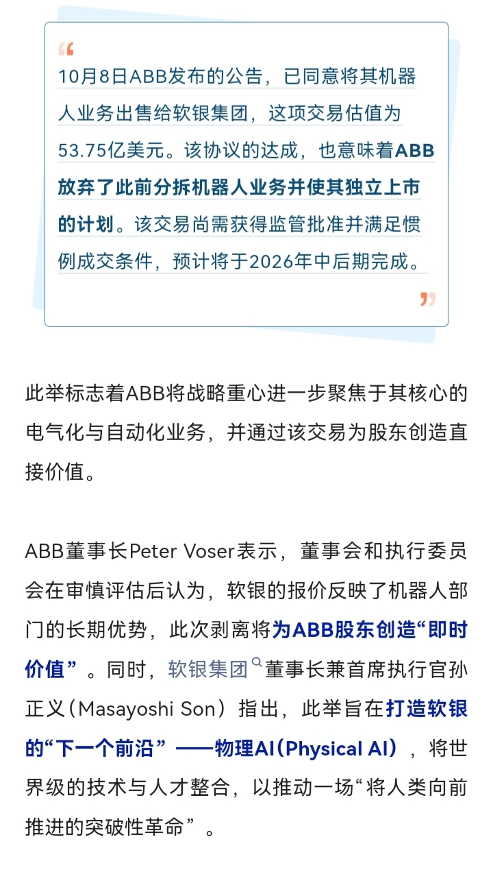 $长安汽车(SZ000625)$ 哈哈,世界4大机器人库卡 发那科 安川 ABB已经有两家卖掉了。库卡机器人卖给美的,ABB机器人即将归入软银!