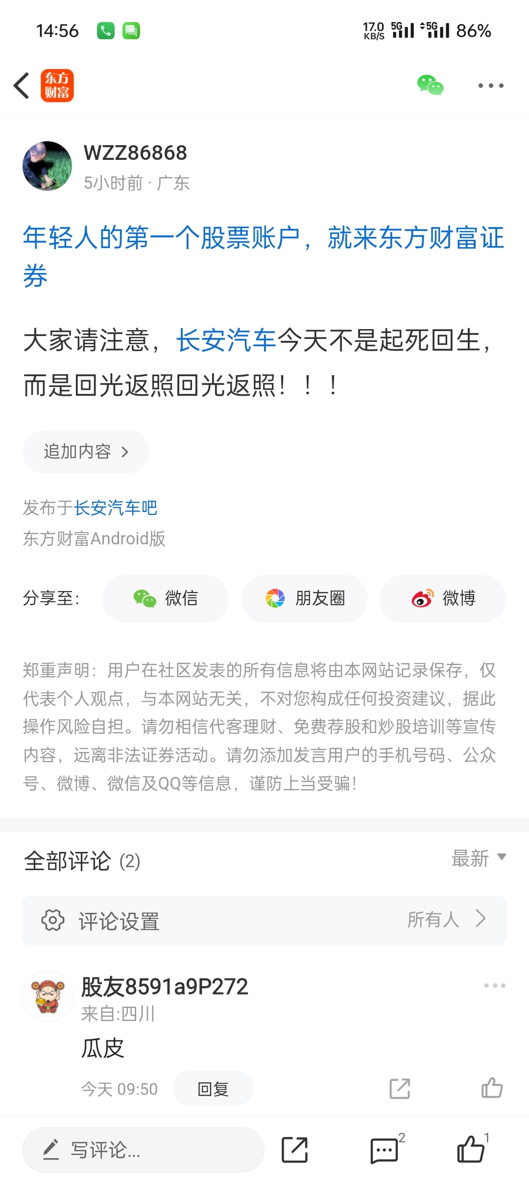 温馨提示: 1.根据《证券法》规定,禁止编造、传播虚假信息或者误导性信息,扰乱证券市场;2.用户在本社区发表的所有资料、言论等仅代表个人观点,与本网站立场无关,不对您构成任何投资建议。用户应基于自己的独立判断,自行决定证券投资并承担相应风险。《东方财富社区管理规定》