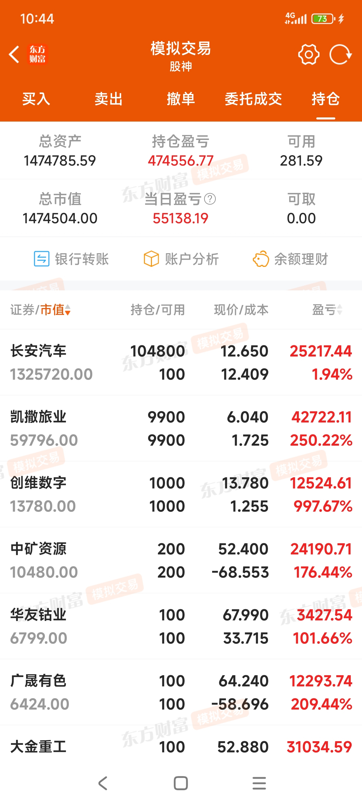 模拟炒股100万本金,盈利47万,继续看多长安,明天长安上涨5个点