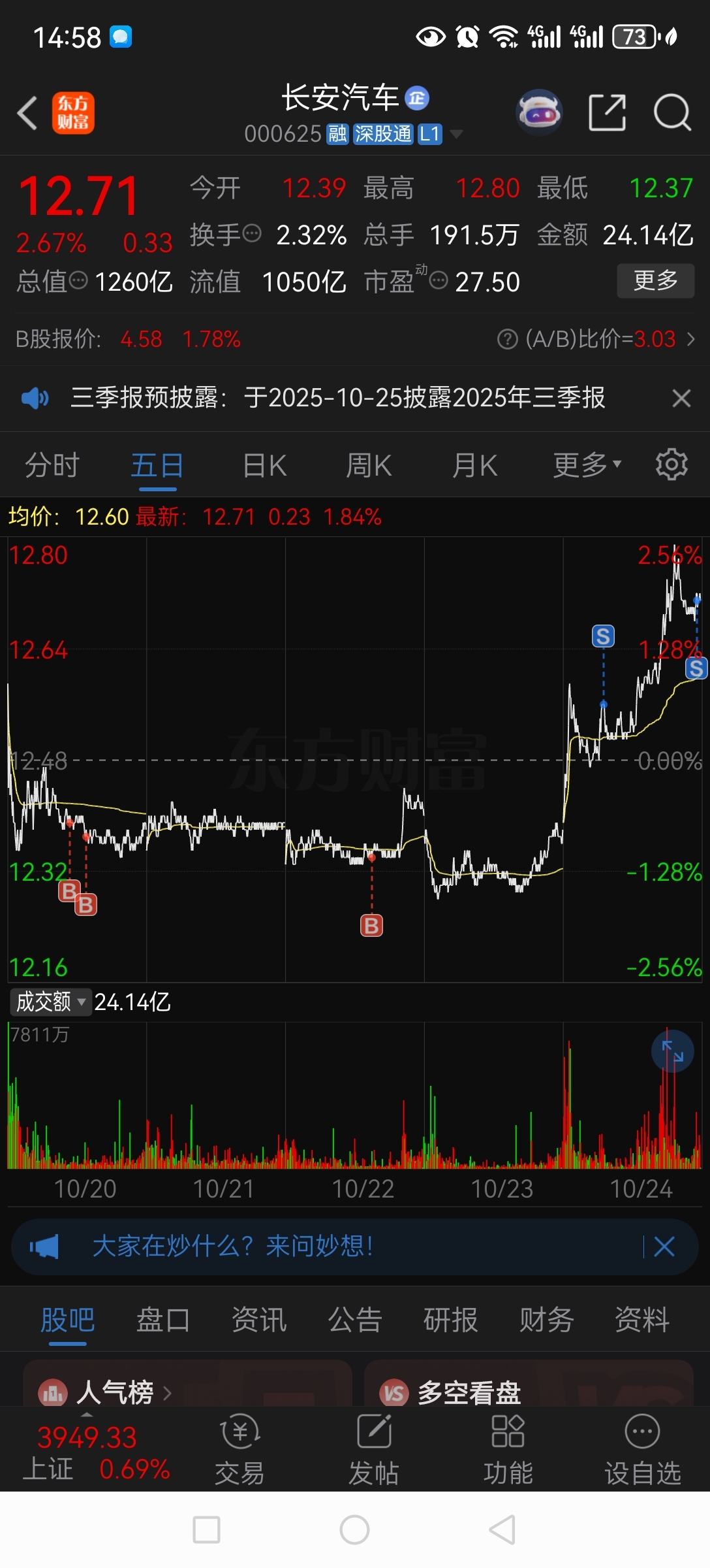 $长安汽车(SZ000625)$ 我是韭菜,我格局小,今天跑了一半,现成本12.146