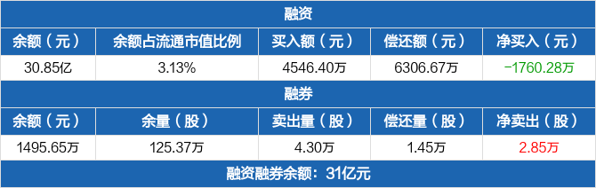 融资方面,当日融资买入4546.4万元,融资偿还6306.67万元,融资净偿还1760.28万元。融券方面,融券卖出4.3万股,融券偿还1.45万股,融券余量125.37万股,融券余额1495.65万元。融资融券余额合计31亿元。
