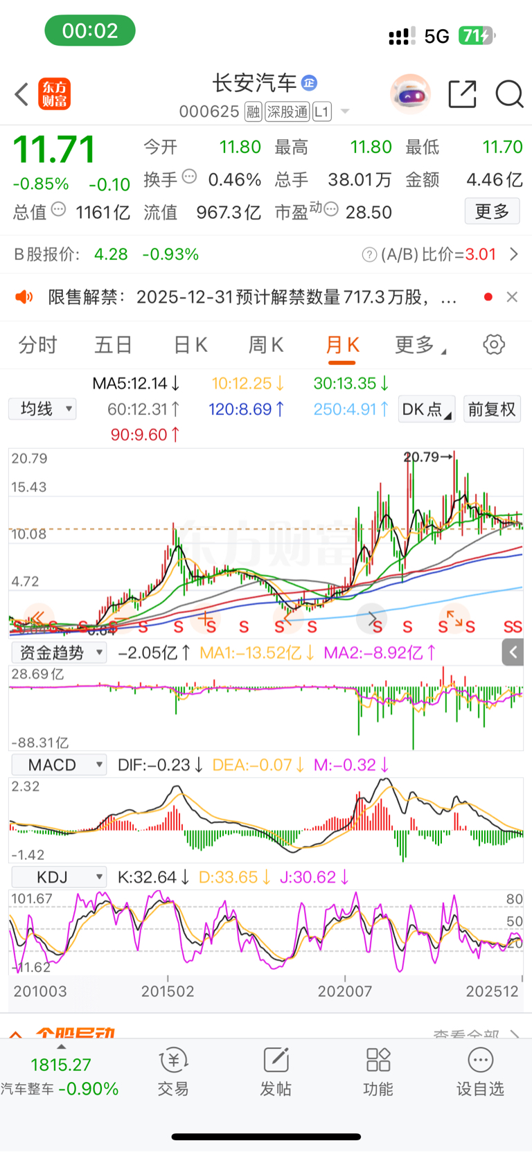$长安汽车(SZ000625)$ 看月线还是太高了,可能。本来几次都,倒亏八千割肉了,割肉了半个月了,继续等。看能不能破9