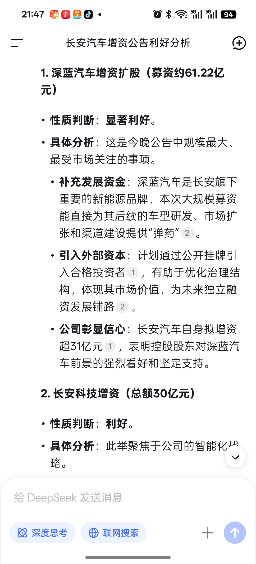 $长安汽车(SZ000625)$ 其实对于各种消息的解读咱们都是一知半解的,前面发了这么多的利好消息都属于空话,这次属于真金白银的利好,今天尾盘拉了一下,证明机构比咱们先知道了消息,他们不傻,我也亏了7个点,好多兄弟们可能比我亏的多,但是有一说一还是希望长安能好起来,正确解读是——短期无影响,长期重大利好。