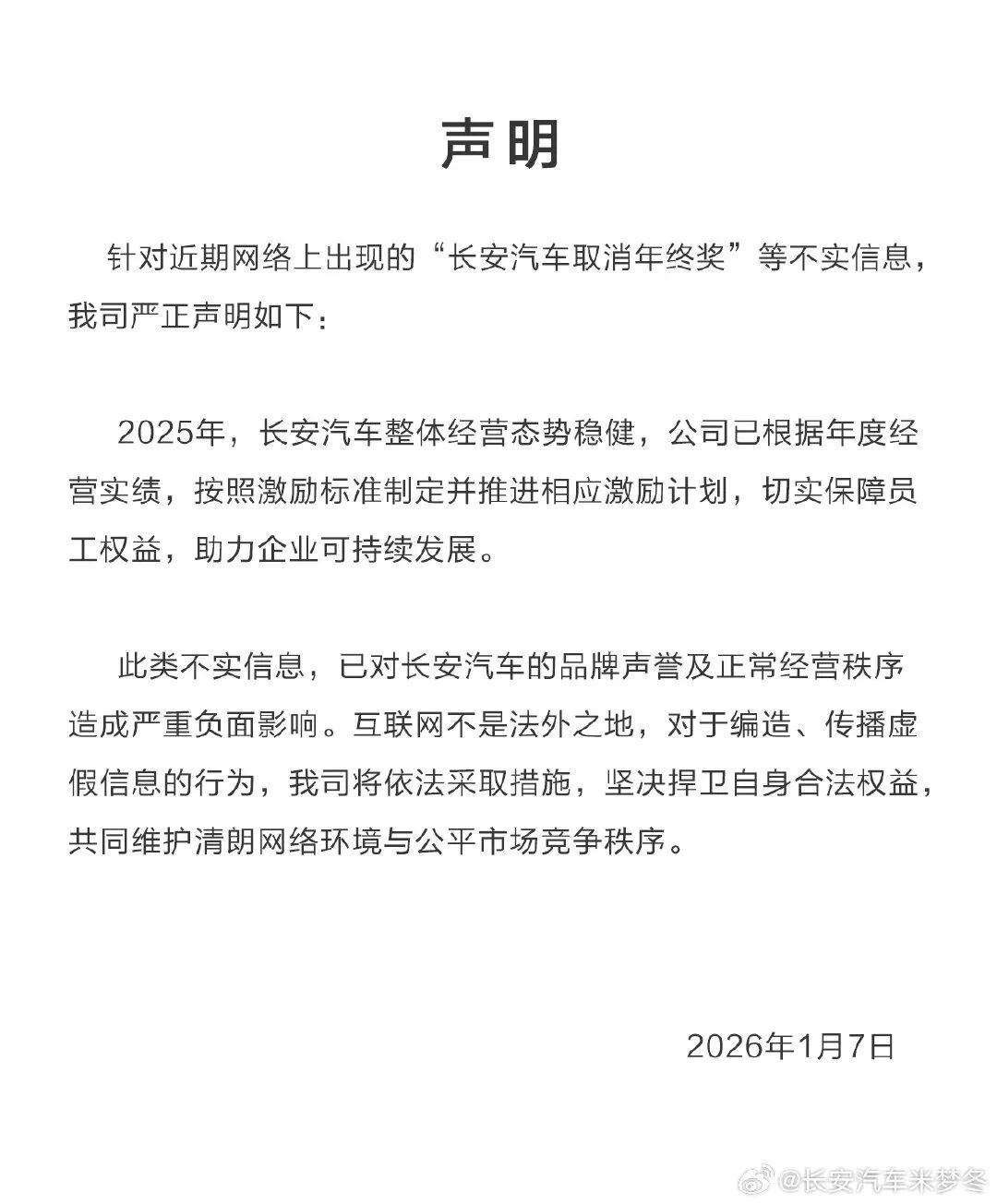 1月7日,长安通过官方渠道发布了《关于长安汽车取消年终奖不实信息的严正声明》,针对网络流传的“取消年终奖”传闻发布严正声明,明确该信息不实,公司已依据2025年经营实绩制定激励计划并推进落实。