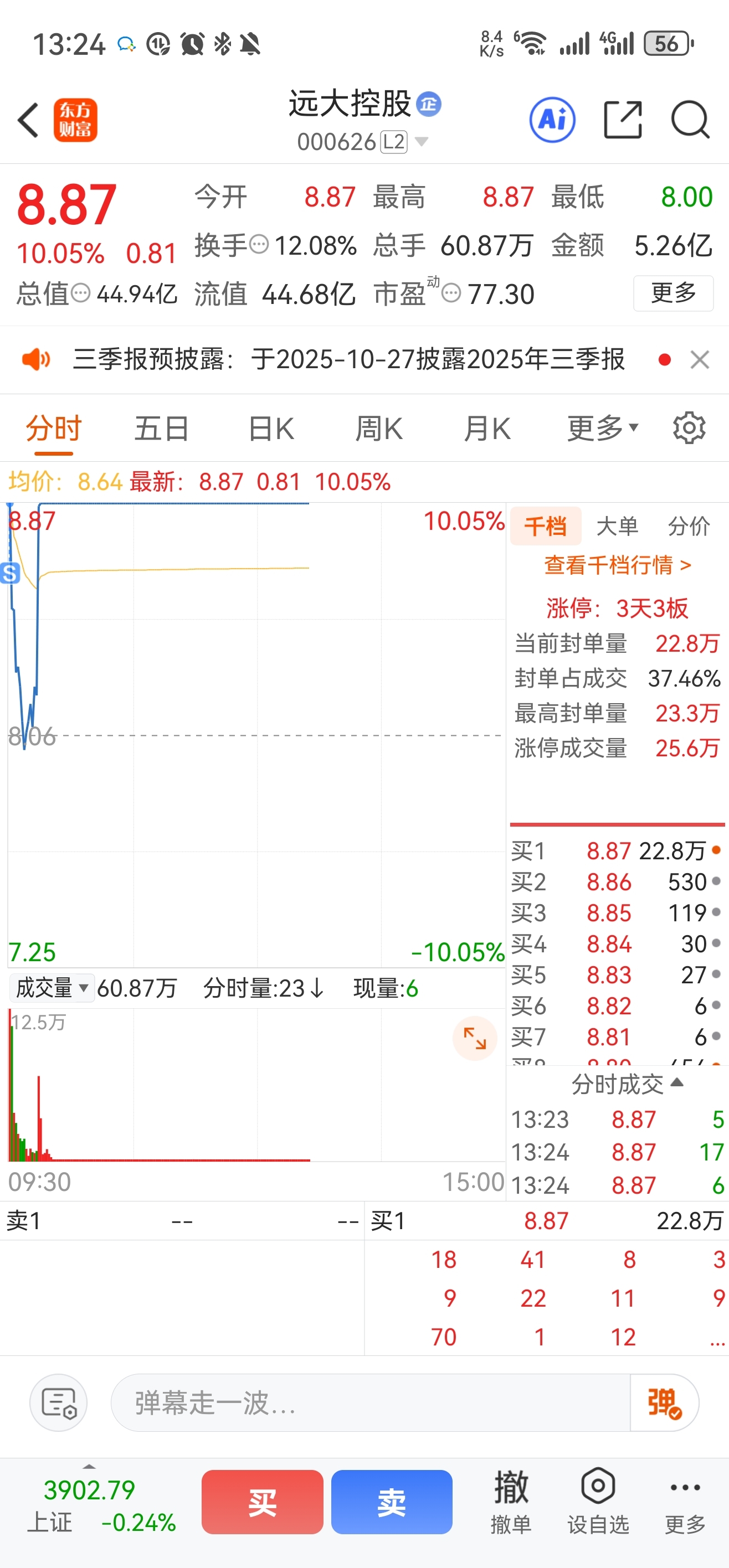 $远大控股(SZ000626)$ 卖飞了,低点不敢接