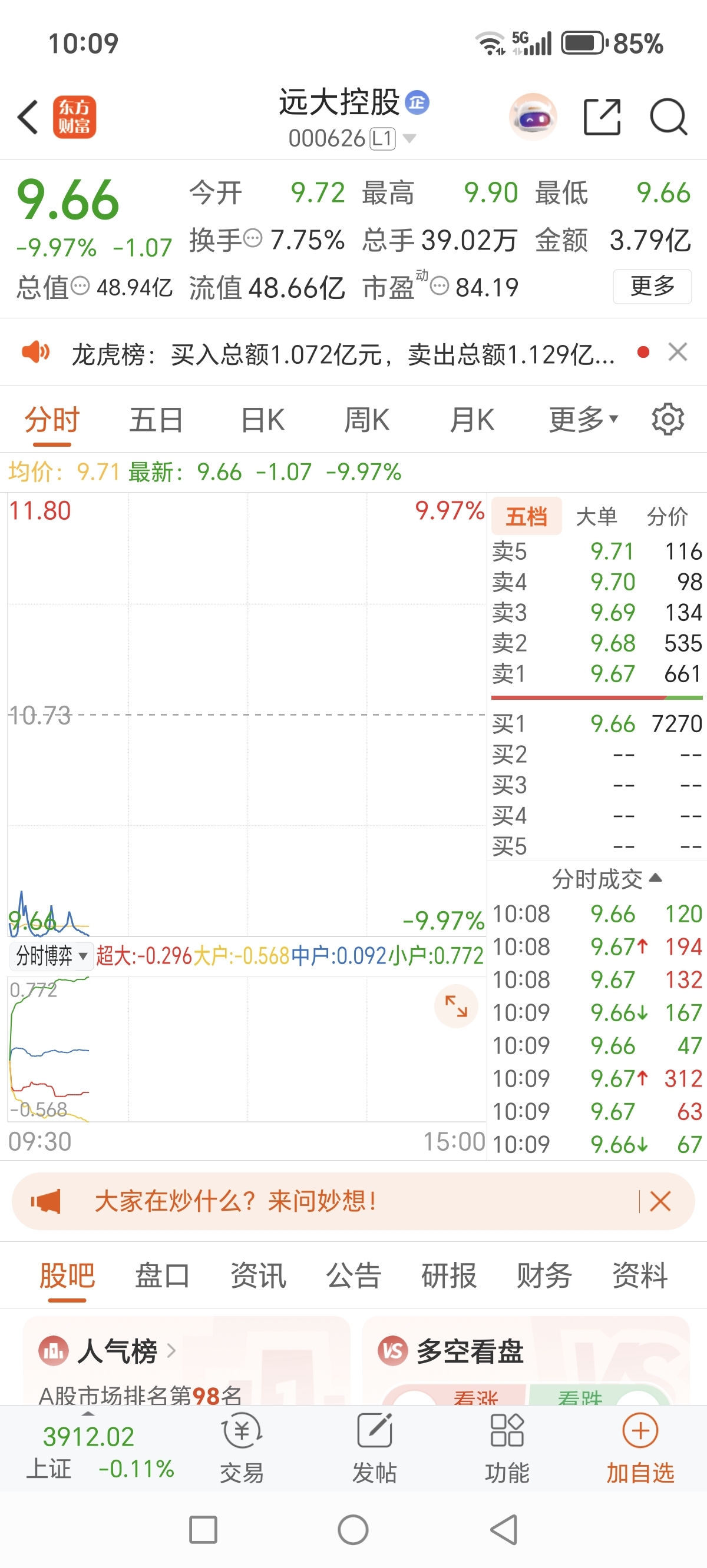 $远大控股(SZ000626)$ $上证指数(SH000001)$ 我朋友刚在跌停板上全仓买入,他说准备要数钱了,我好羡慕他