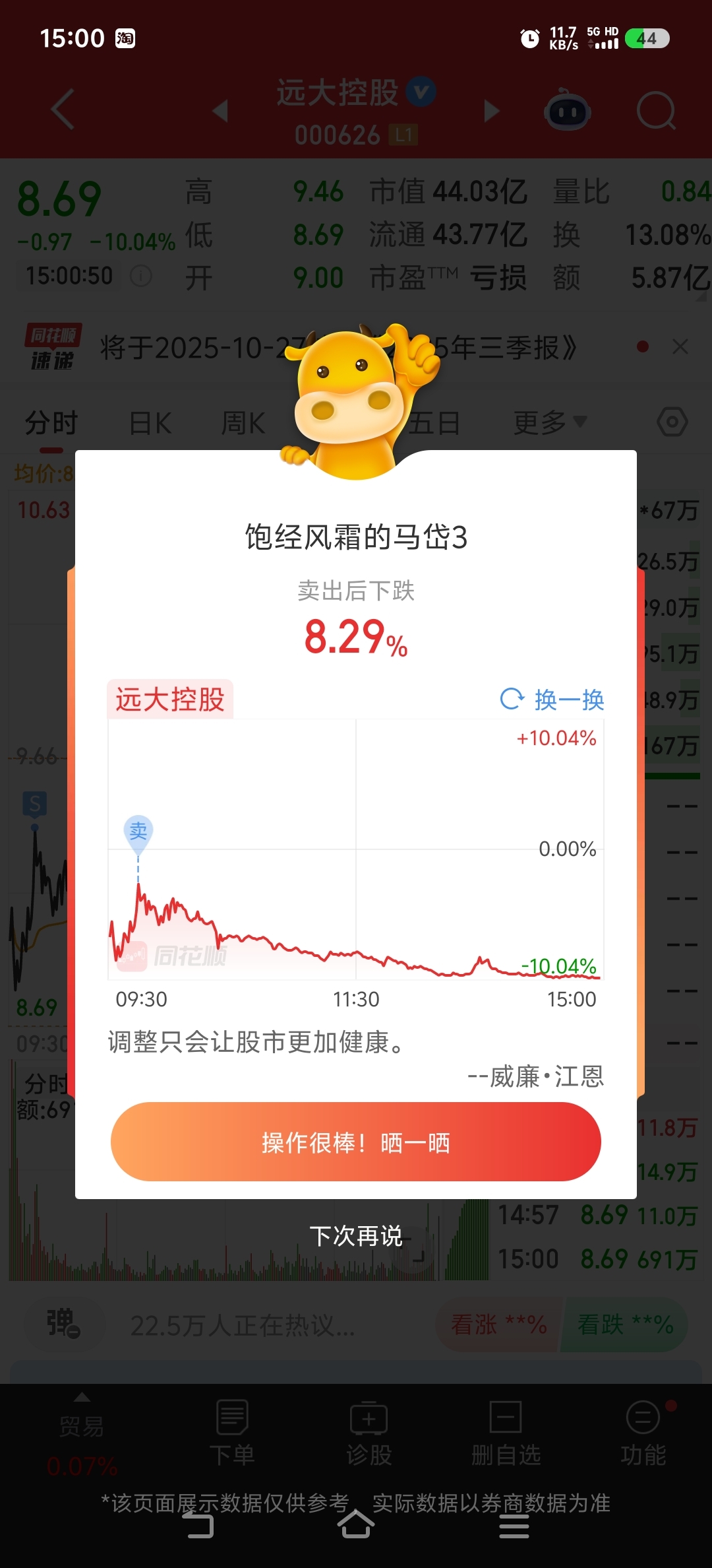 $远大控股(SZ000626)$ 还好不贪走了小亏两个点