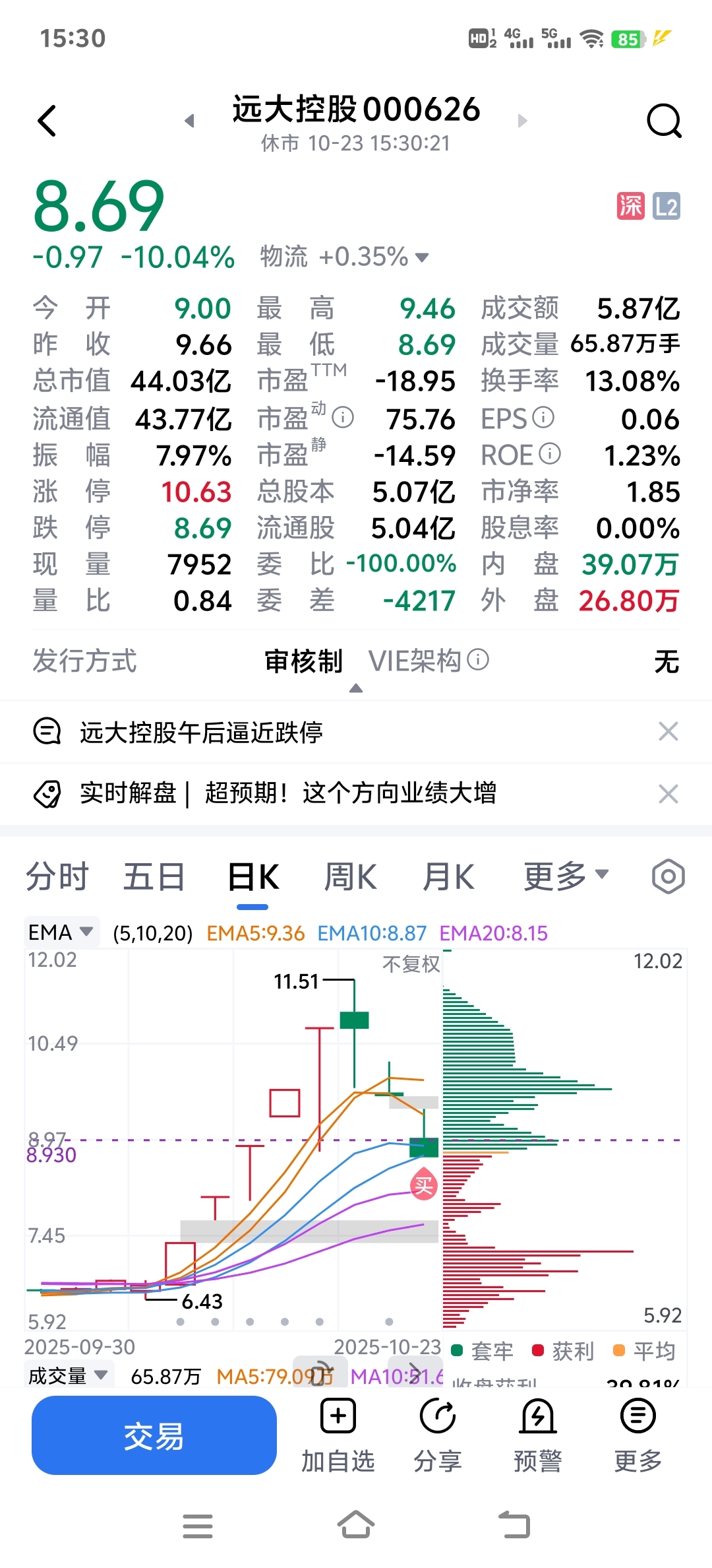 $远大控股(SZ000626)$ 明天能保本出来就行,红三个点。