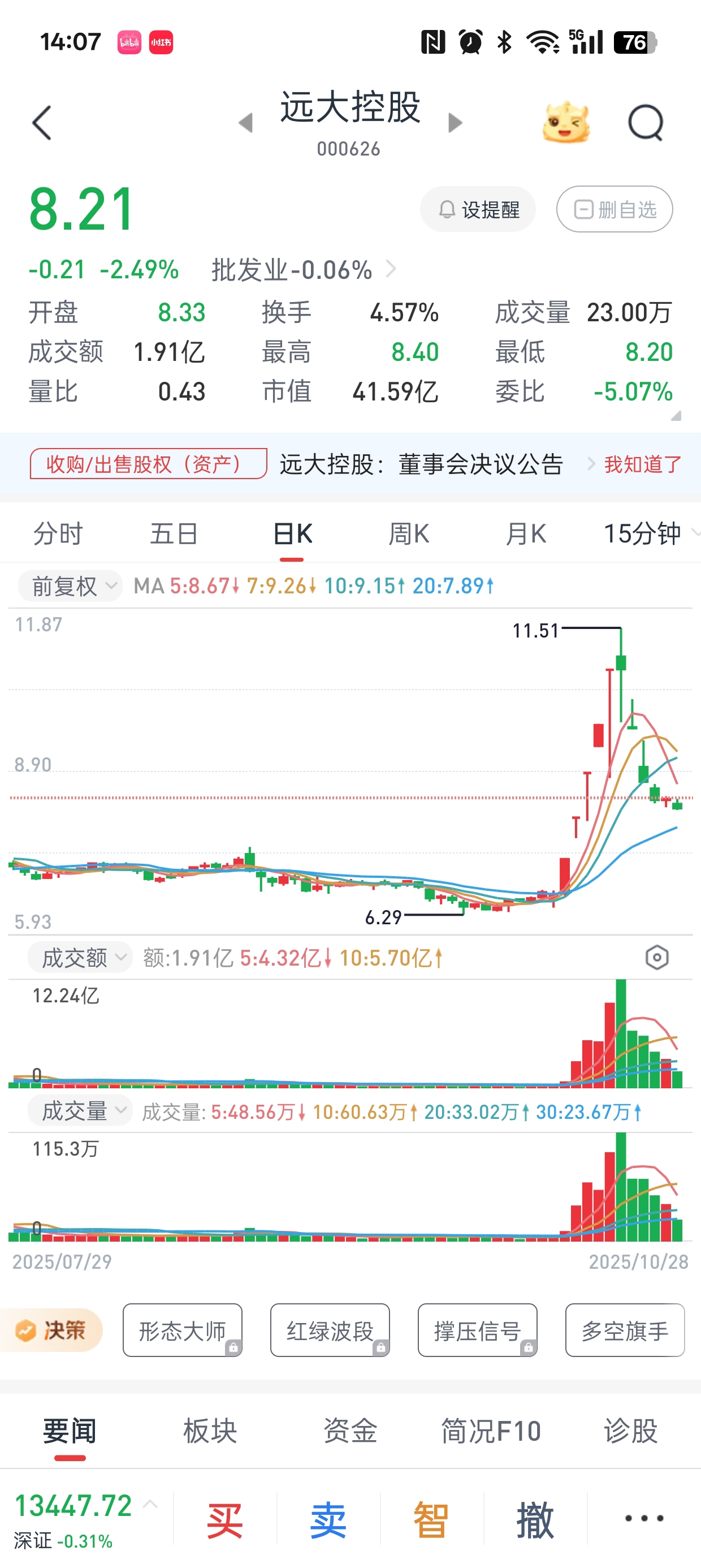 $远大控股(SZ000626)$ 真跌到20日线那不是机会,那是真的飞舞了。