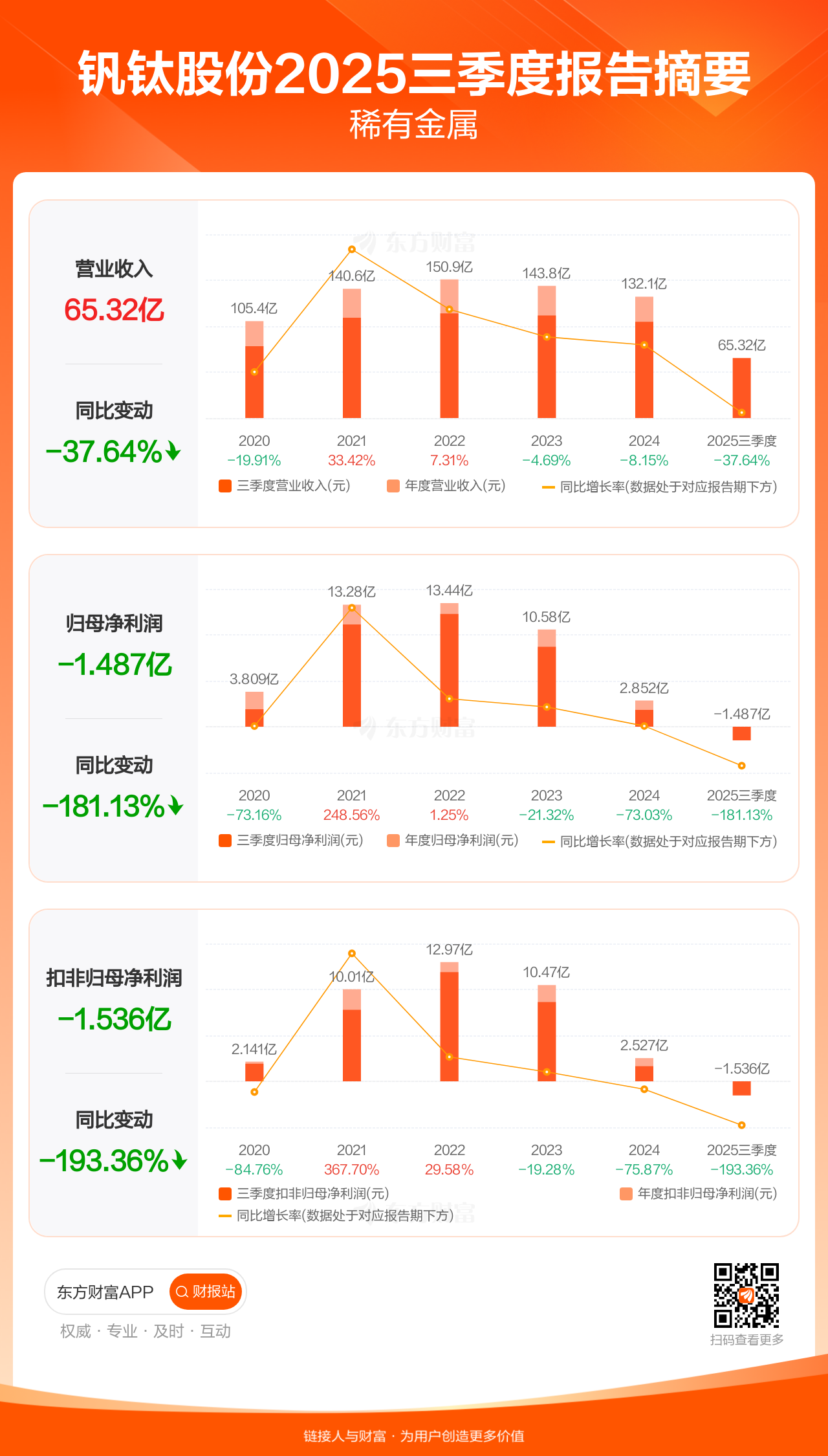 钒钛股份10月27日发布2025年三季报显示,公司前三季实现营业收入65.32亿元,同比下滑37.64%;归母净利润-1.49亿元;扣非归母净利润-1.54亿元。