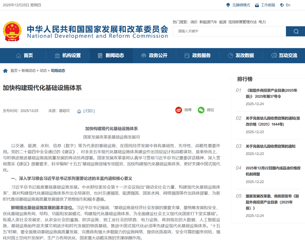 12月25日,国家发展改革委基础设施发展司发表文章《加快构建现代化基础设施体系》
