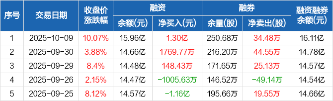 融资方面,当日融资买入4.53亿元,融资偿还3.22亿元,融资净买入1.3亿元,连续3日净买入累计1.49亿元。融券方面,融券卖出37.64万股,融券偿还3.16万股,融券余量250.68万股,融券余额1479.01万元。融资融券余额合计16.11亿元。