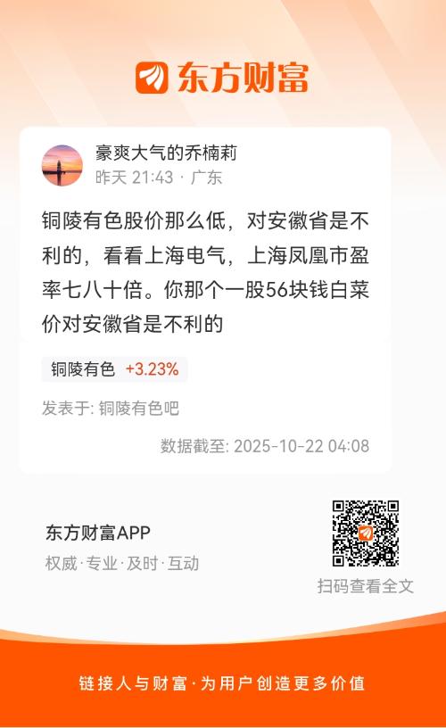 铜陵有色股价那么低,对安徽省是不利的,看看上海电气,上海凤凰市盈率七八十倍。你那个一股56块钱白菜价对安徽省是不利的
