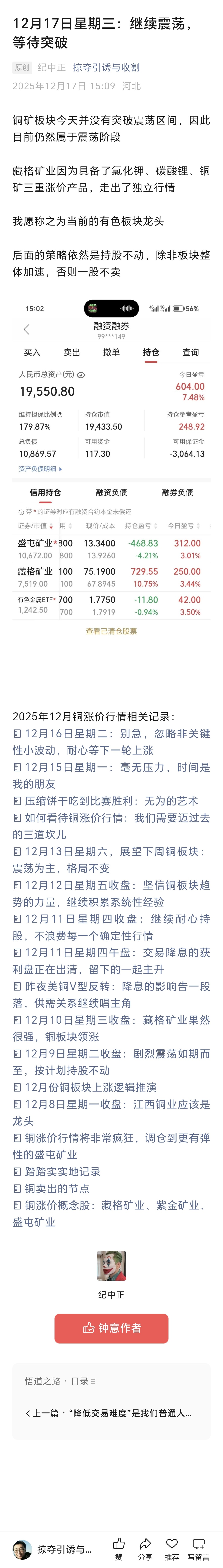 12月17日星期三:继续震荡,等待突破$铜陵有色(SZ000630)$ $西部矿业(SH601168)$ $云南铜业(SZ000878)$