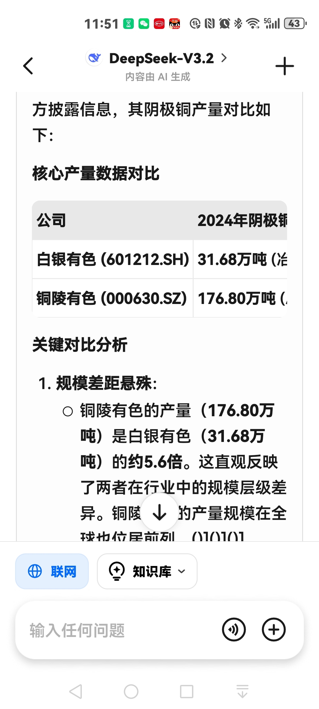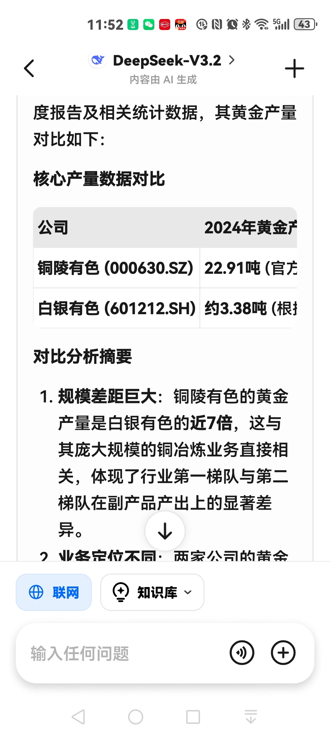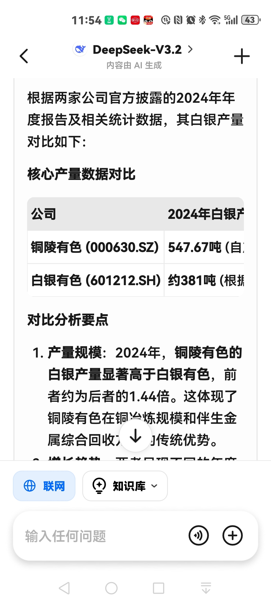 铜陵有色和白银有色2024年的金,白银,铜产量的对比。
