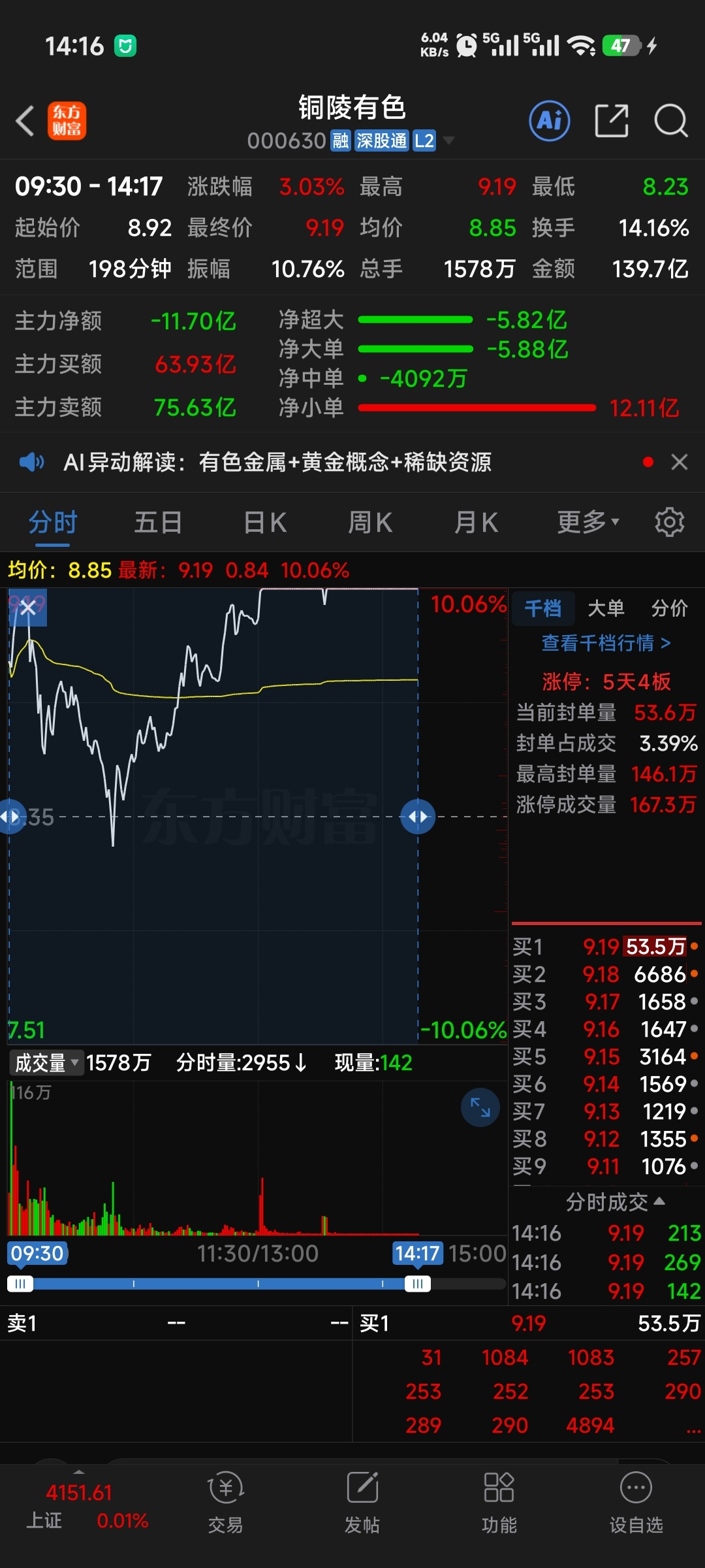 $铜陵有色(SZ000630)$ 超大单出货12亿。全是中小单接盘。