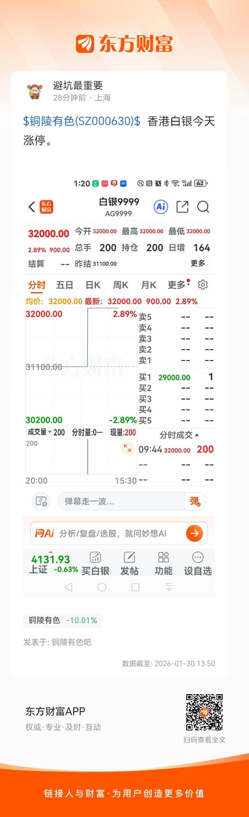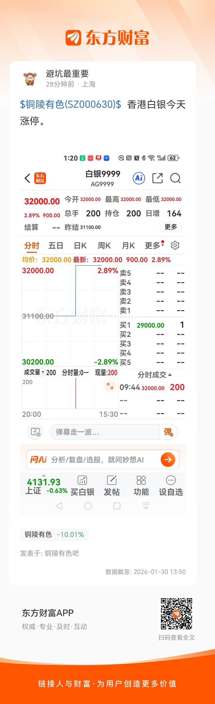 $铜陵有色(SZ000630)$  香港白银今天涨停。