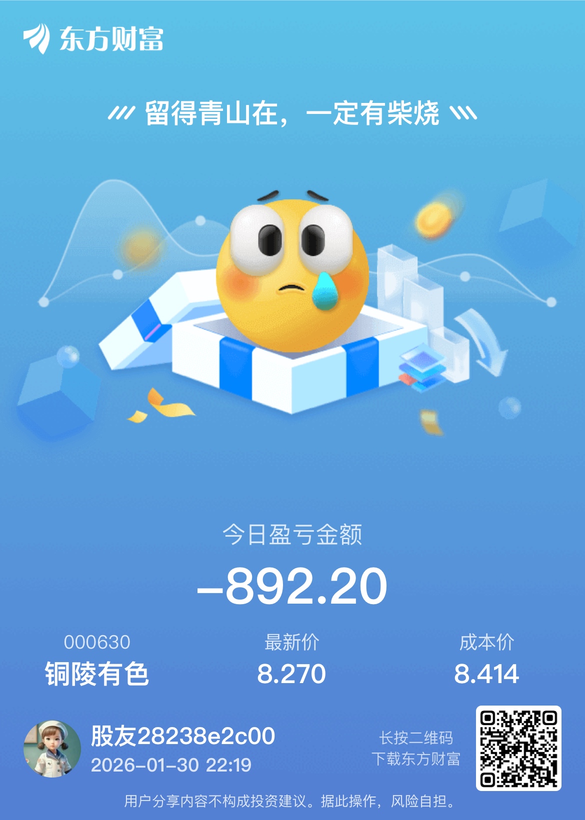 温馨提示: 1.根据《证券法》规定,禁止编造、传播虚假信息或者误导性信息,扰乱证券市场;2.用户在本社区发表的所有资料、言论等仅代表个人观点,与本网站立场无关,不对您构成任何投资建议。用户应基于自己的独立判断,自行决定证券投资并承担相应风险。《东方财富社区管理规定》