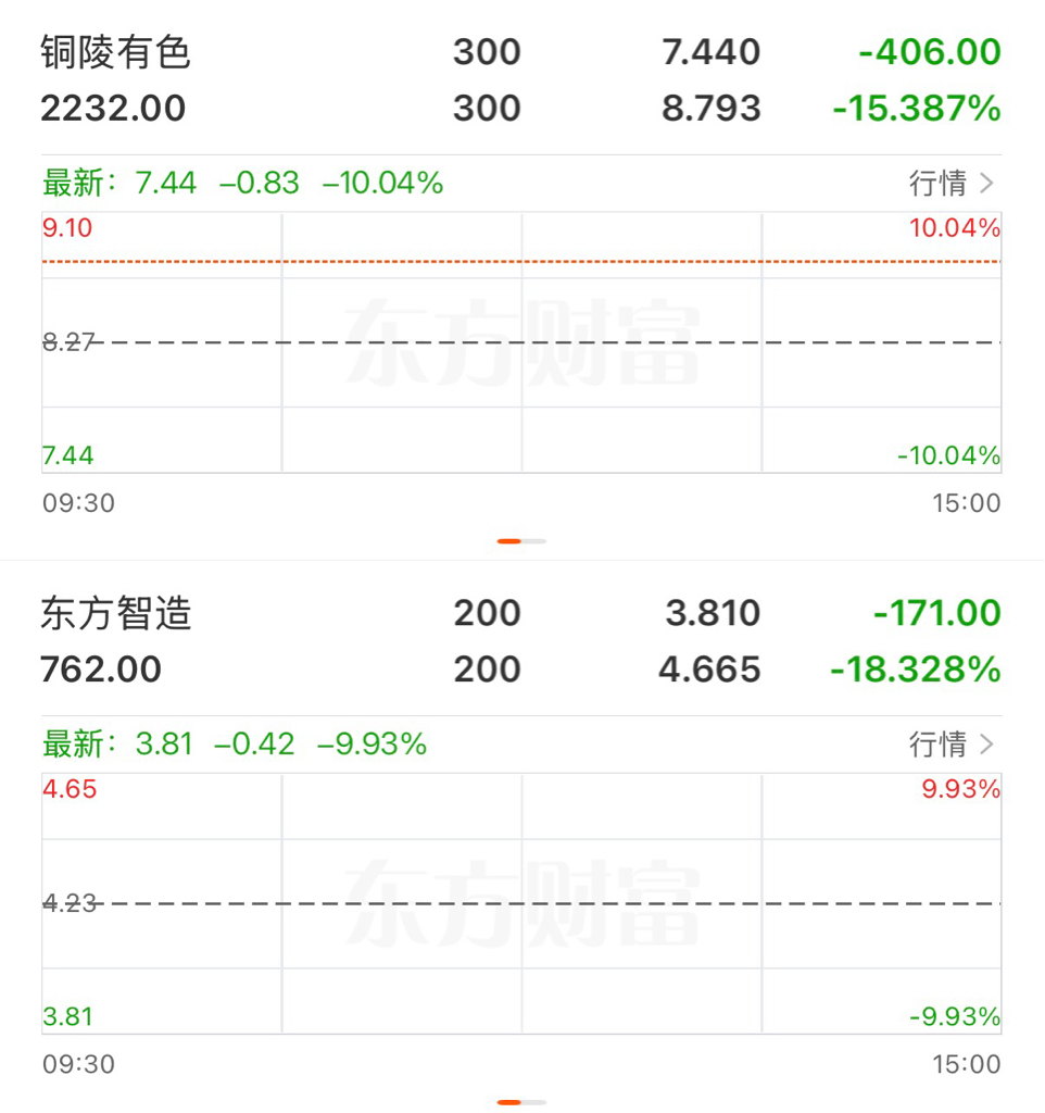 $铜陵有色(SZ000630)$ $东方智造(SZ002175)$ 可以可以,纪念一下,入大a以来的一天两个跌停,没几个钱,多了一份不一样的经验。