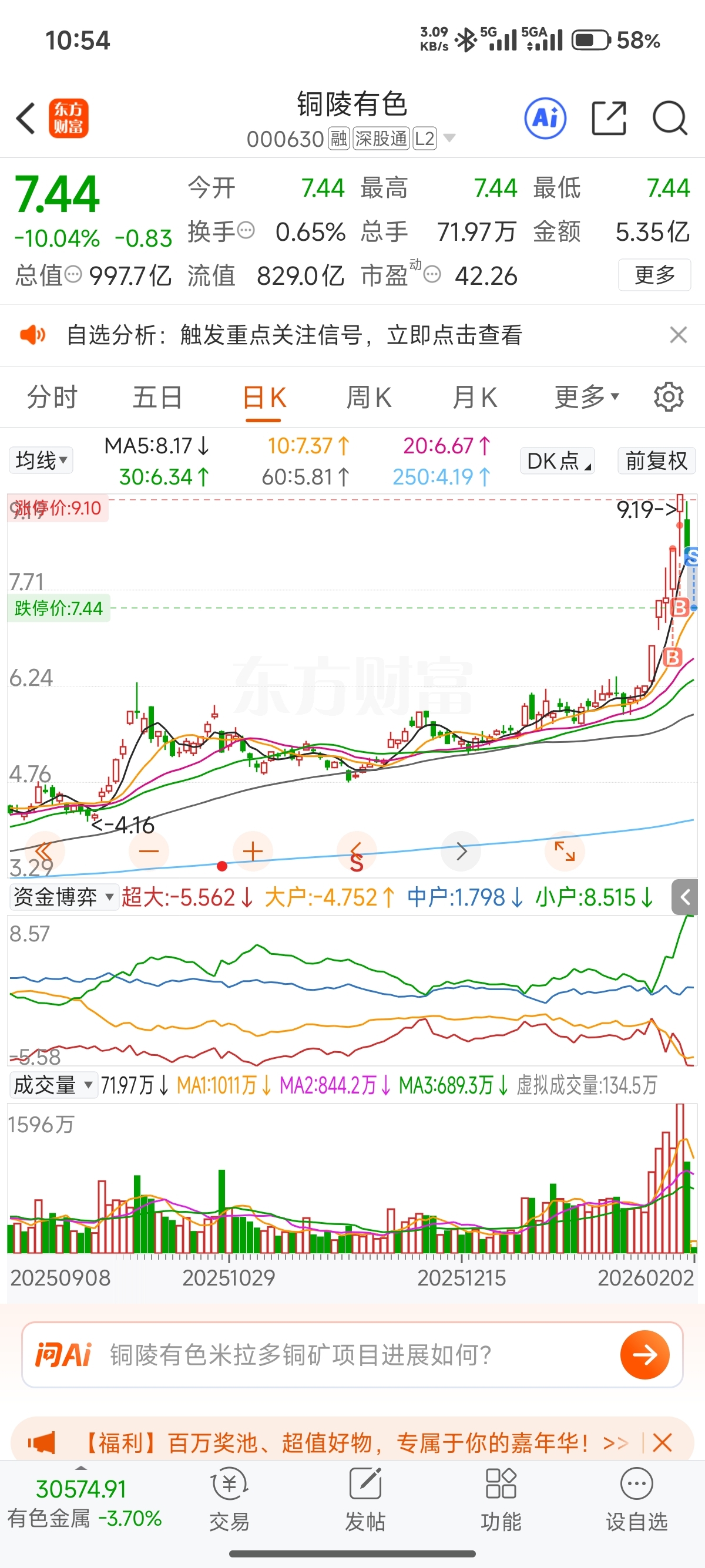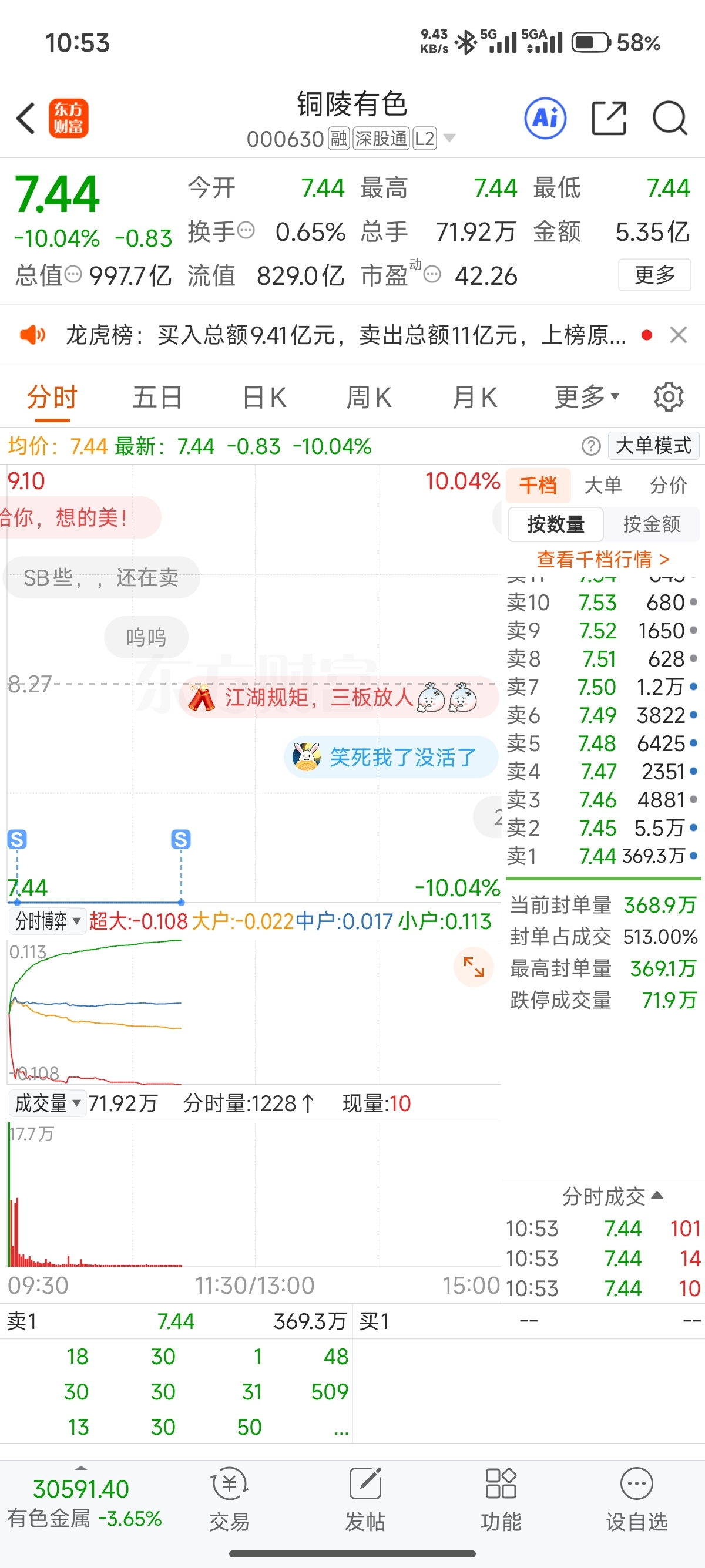 $铜陵有色(SZ000630)$ 上周五贪念作怪啊,想红盘卖,结果跌下去了,本来跌停也还有机会跑,也还能赚钱走,但还YY金属行情不会结束,这下好了,只能再计提10厘米走人,不尊重市场,不尊重盘面,不长记性,活该被打