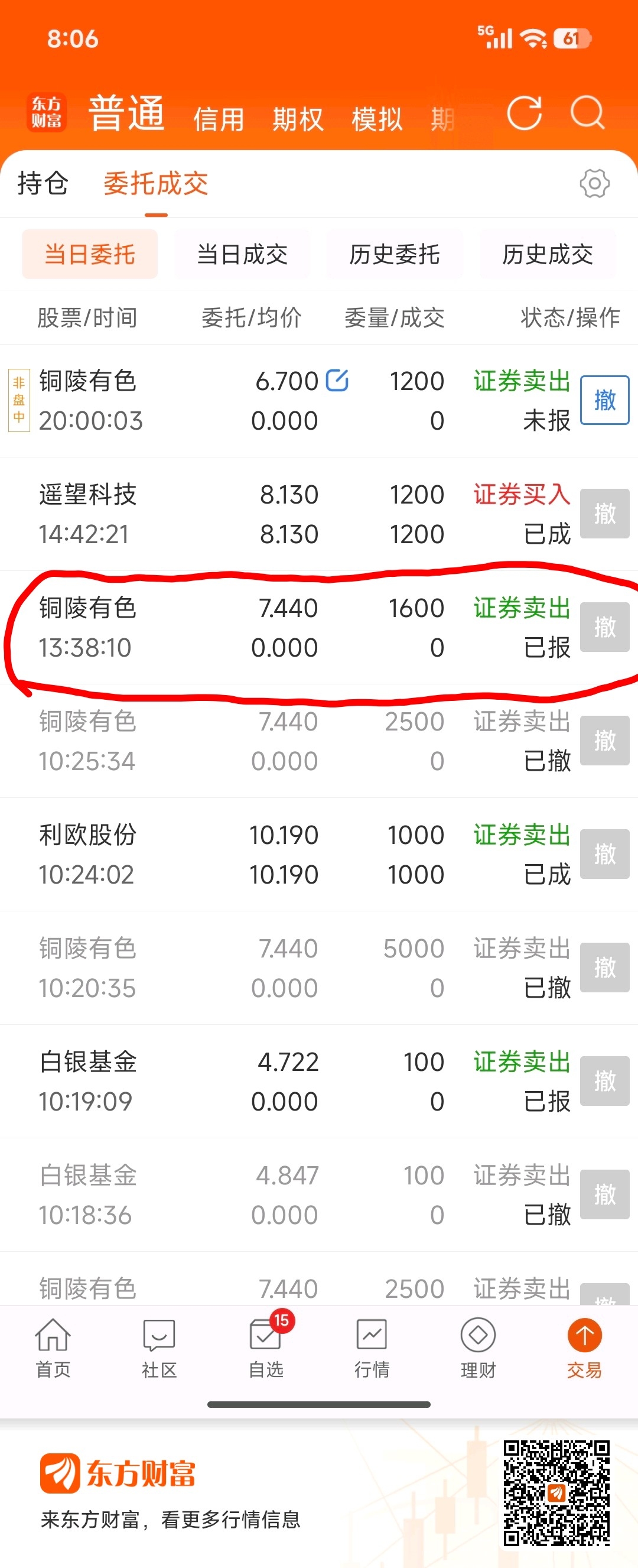 $铜陵有色(SZ000630)$ 为什么下午挂的单撤不了?