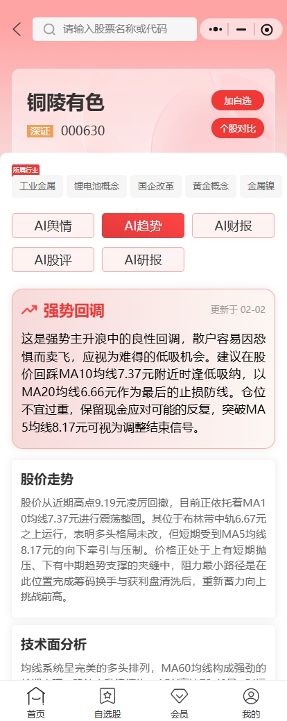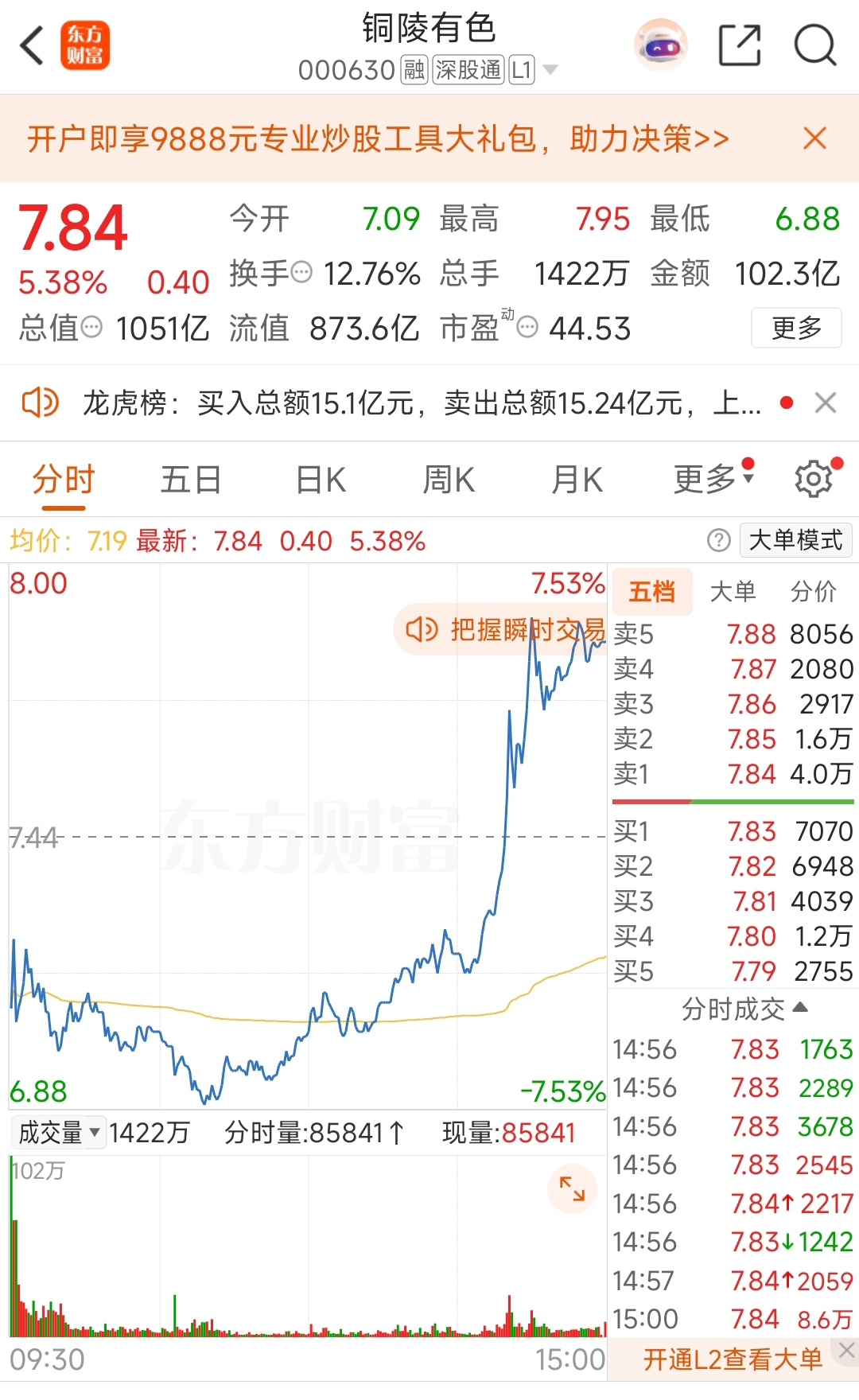 今天$铜陵有色(SZ000630)$ 反弹了,低开高走收涨 5.38%,直接把前两天有色板块的回调缺口补了大半。当前希财舆情宝给铜陵有色的股价趋势分析是强势主升浪中的良性回调,根据分析提示,今天在6块多的时候又加了一点点,后续应该能有得涨。仓位不宜过重,保留现金应对可能的反复,突破MA5均线8.17元可视为调整结束信号。