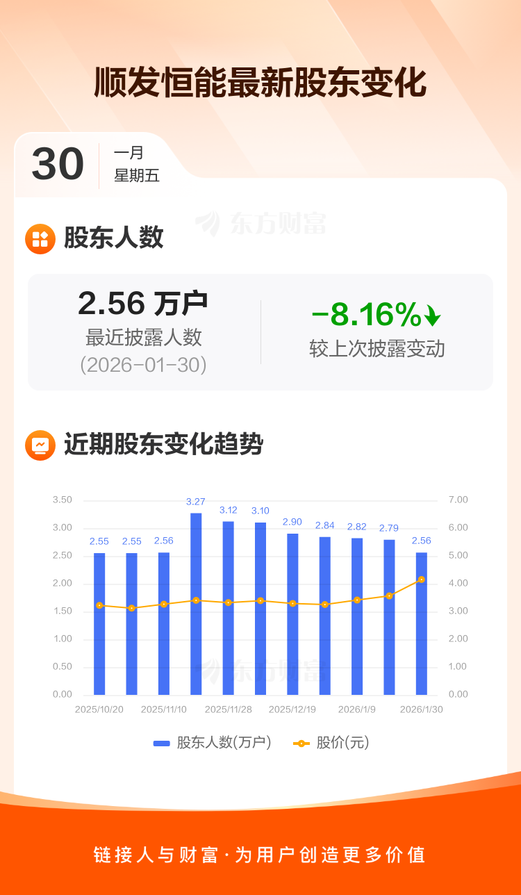 顺发恒能:截至1月30日最新股东户数2.56万户,较上期减少8.16%
